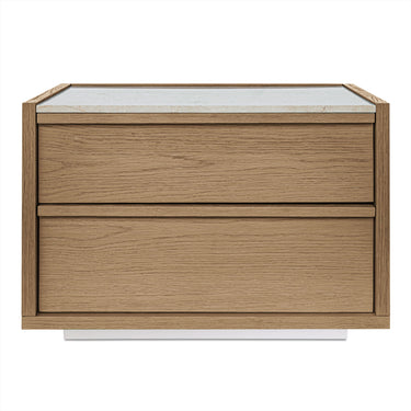 - Light rosa marble top atop solid oak frame with oak veneer body & drawer front. Metal base