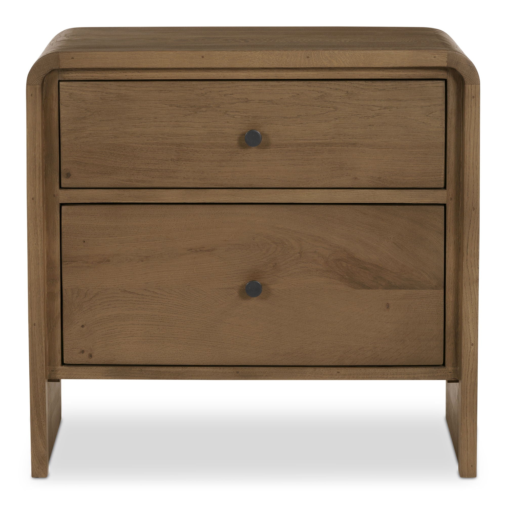 Featuring a unique waterfall edge and overhang detailing, the Riley nightstand offers captivating visual interest, underscored by its solid oak construction. The seamless design is a timeless blend of sophistication and practicality, with ample two-drawer storage.