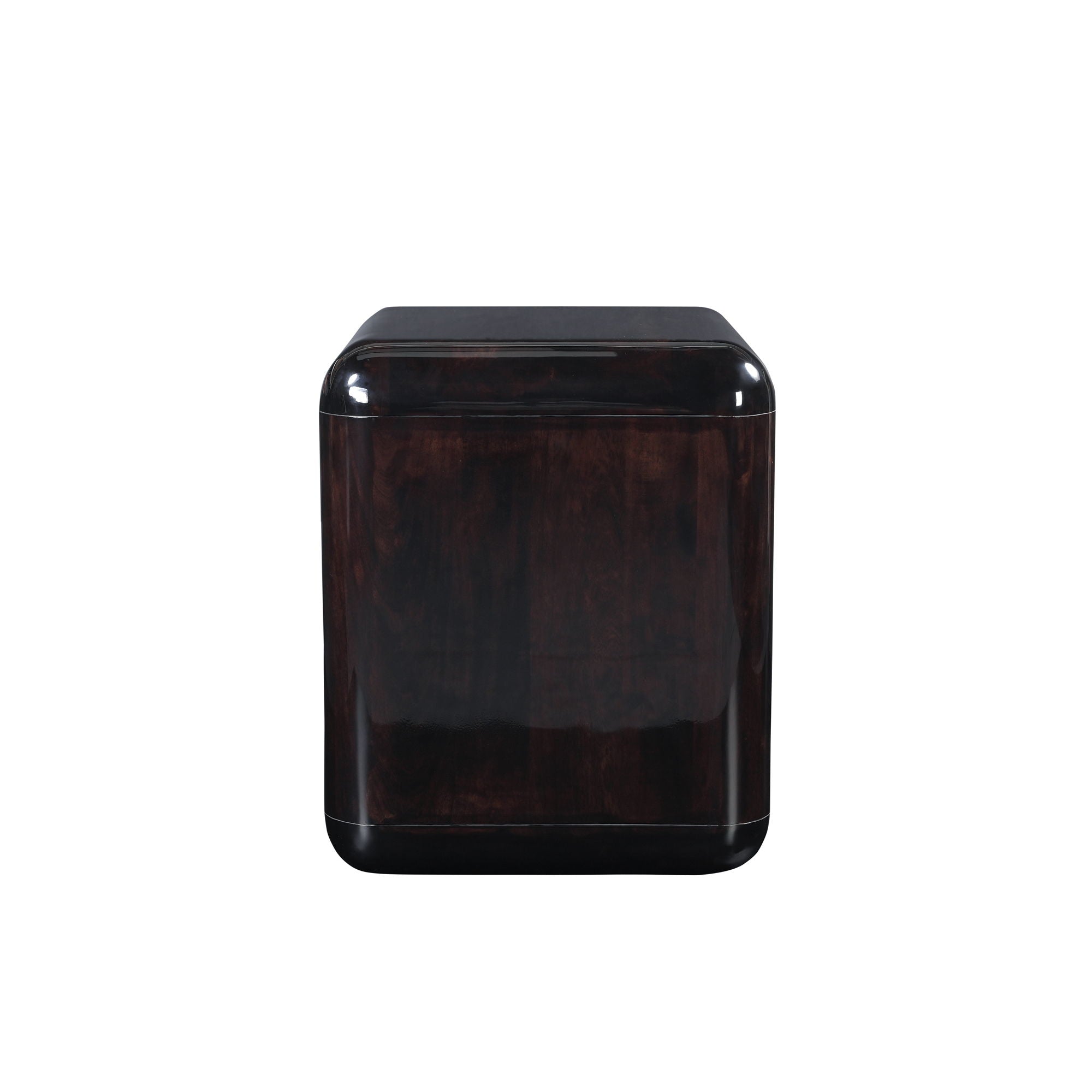 - A high-gloss nightstand with rounded corners that add softness to its boxy shape