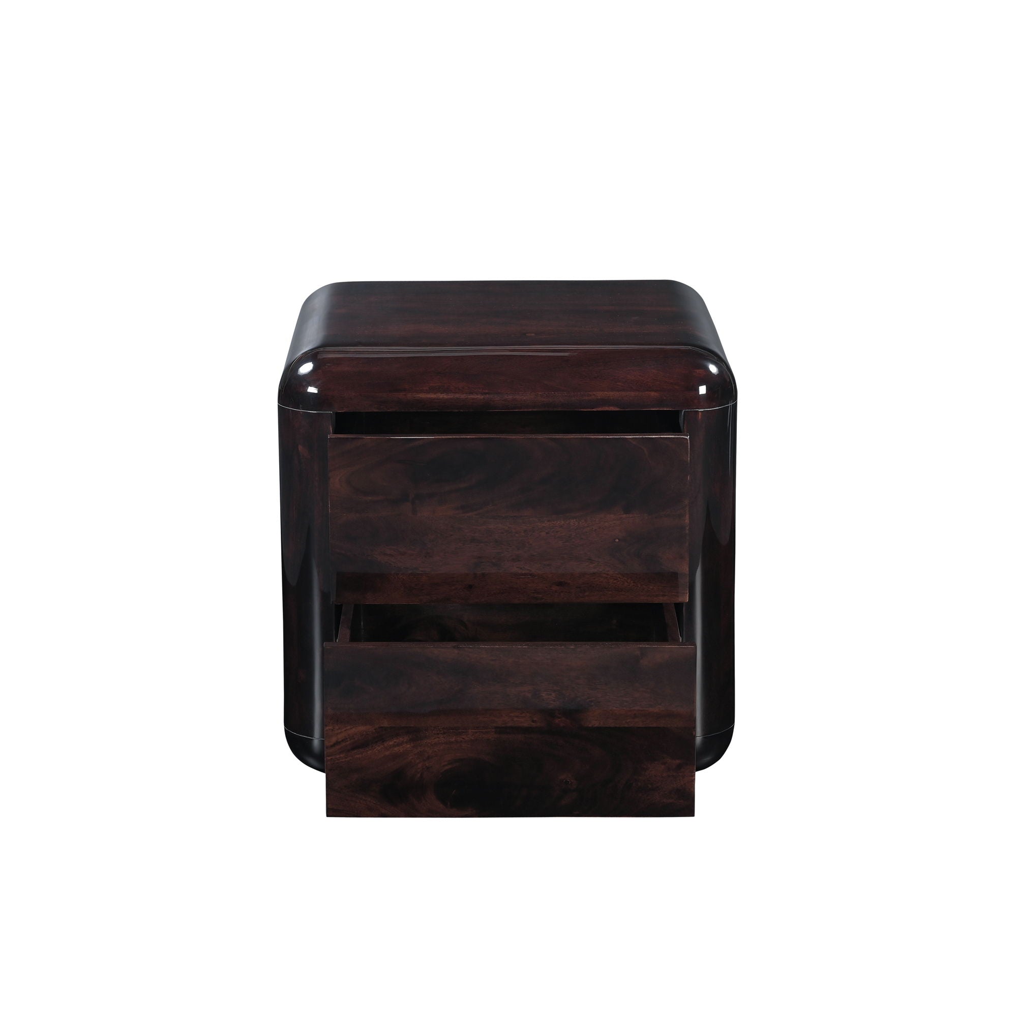 The Rory nightstand introduces sleek sophistication into the bedroom sanctuary. This high-gloss Acacia nightstand showcases beautifully rounded corners and a soft, boxy shape, allowing it to float effortlessly within the room. Two push-to-open drawers with side-mounted glides offer discreet storage. The lustrous finish and clean lines create a contemporary aesthetic that complements various decor styles, adding a touch of refined elegance to any space.