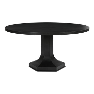 The Ethan dining table blends geometric precision with fluid grace. Its substantial tabletop rests upon a hexagonal base with gently curving sides, creating a continuous silhouette that marries strength and elegance. Crafted entirely from cast iron with a rich black finish, this sophisticated focal point whispers graceful appeal.