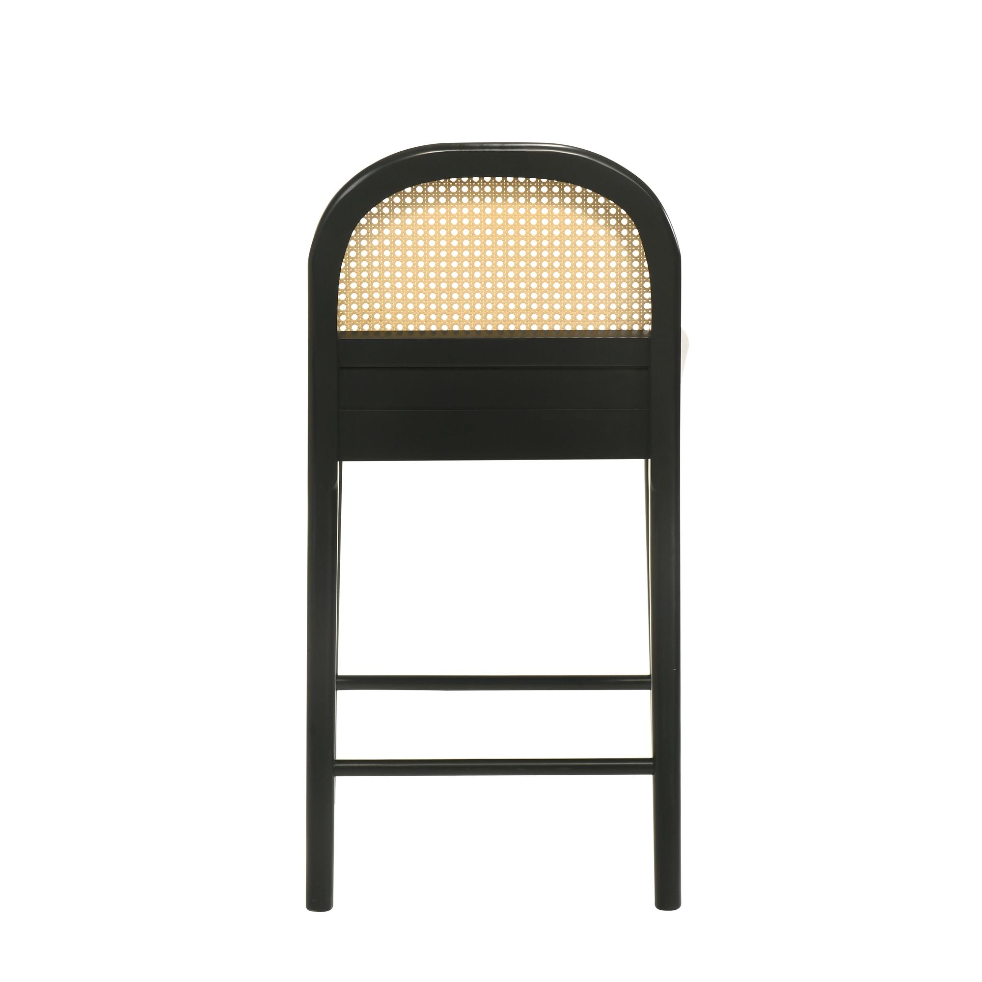 The Lucio Barstool Collection blends refined craftsmanship with relaxed comfort, bringing a touch of modern sophistication to any kitchen or dining setting. Designed with clean lines, natural materials, and subtle detailing, Lucio perfectly captures the balance between mid-century and modern farmhouse design. Its signature feature — a gently curved cane backrest framed in solid natural wood — introduces organic texture, while the plush white boucle performance fabric seat offers inviting softness and long-lasting durability. Available in two timeless finishes — Black for a bold, contemporary look and Amber Glow for a warm, natural tone — the Lucio stool elevates both modern and rustic spaces. The rich grain of the solid natural wood base is sealed with a smooth finish that highlights its natural character without appearing overly rustic. The combination of light boucle upholstery and airy cane detailing gives the stool a cozy yet refined personality, making it a versatile choice for both minimalist and decorative interiors. Comfort is a priority in Lucio’s design. The arched backrest supports the spine gently, while the generously padded seat ensures comfort for extended use. The integrated footrest bars add stability and ergonomic support, allowing users to sit comfortably for long meals or casual gatherings. With its armless and back-framed silhouette, Lucio slides neatly under most counters when not in use, maintaining a clutter-free and open space. Built to last, the Lucio stool features a solid natural wood frame known for its resilience and structural integrity, paired with performance fabric upholstery that resists spills, wear, and fading. Offered in both counter height and bar height, it suits a variety of setups from kitchen islands to entertainment bars. Assembly is straightforward, requiring minimal time and no specialized tools. Backed by a 1-year limited manufacturer warranty, the Lucio collection is as dependable as it is beautiful — a true balance of timeless design and everyday practicality.