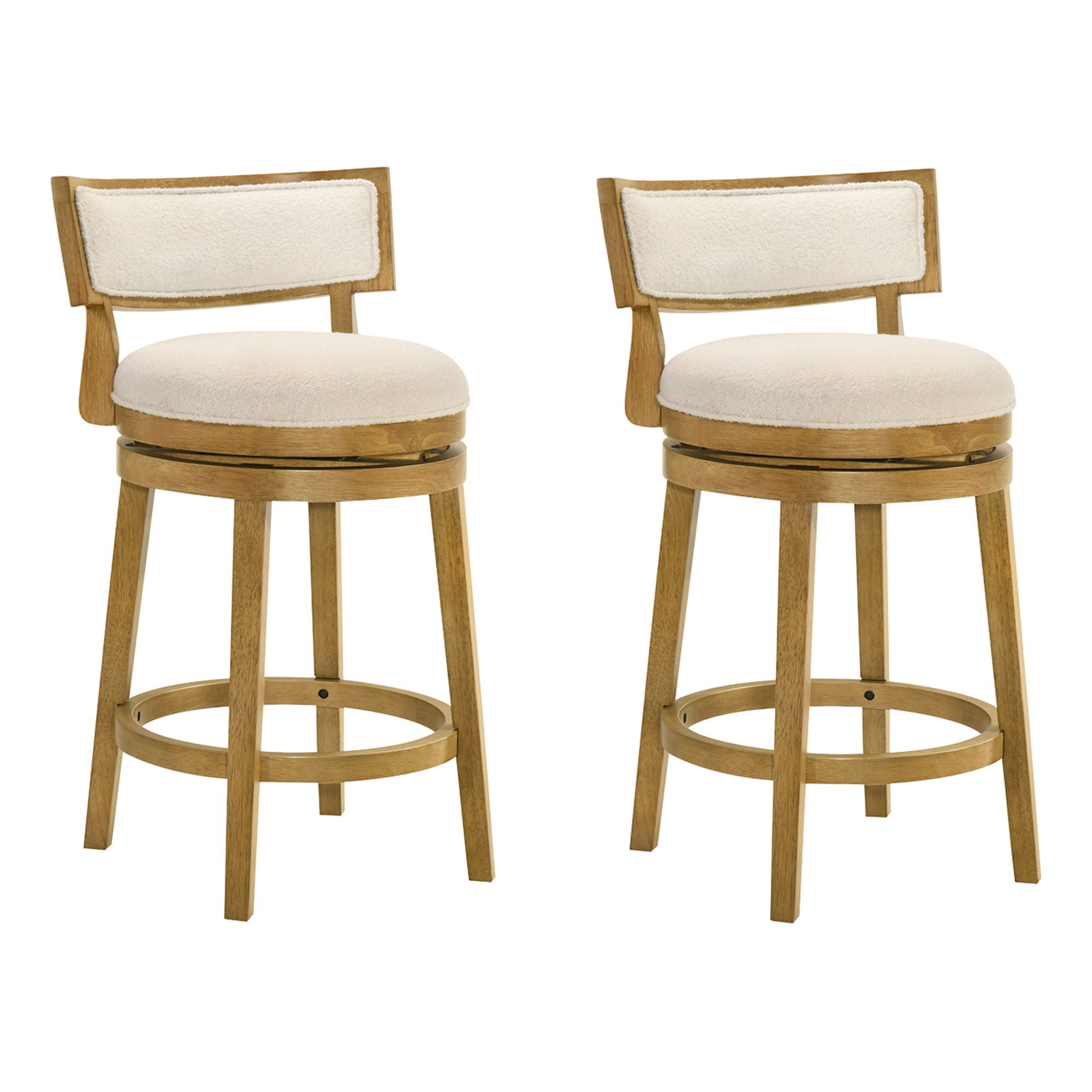 Noely - Modern Farmhouse Swivel Wood Counter Height Kitchen Bar Stool (Set of 2) - Amber Glow Finish With White Boucle Fabric Upholstered Seat