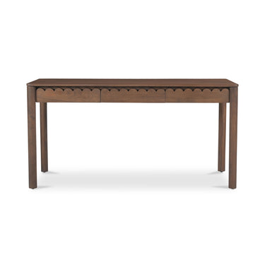 Modern aesthetics effortlessly blend with the refined simplicity of traditional Shaker design in the Wiley desk. Meticulously crafted, its elegant form is defined by sleek, geometric curves that add a captivating touch of modernity. The post legs stand as pillars of strength, grounding the desk with their understated presence. A showcase of intricate scalloped edge details to the faces of the three drawers lends a timeless charm reminiscent of classical influences.