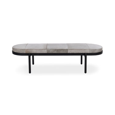 Bring modern elegance to your home with this accent bench crafted with sleek iron legs and a natural hide upholstered seat. Perfect as an entryway bench, bedroom accent, or stylish addition to your living space, it offers durability with a touch of organic texture. The unique hide pattern ensures every piece is one-of-a-kind, blending contemporary design with timeless character for a versatile seating solution.
