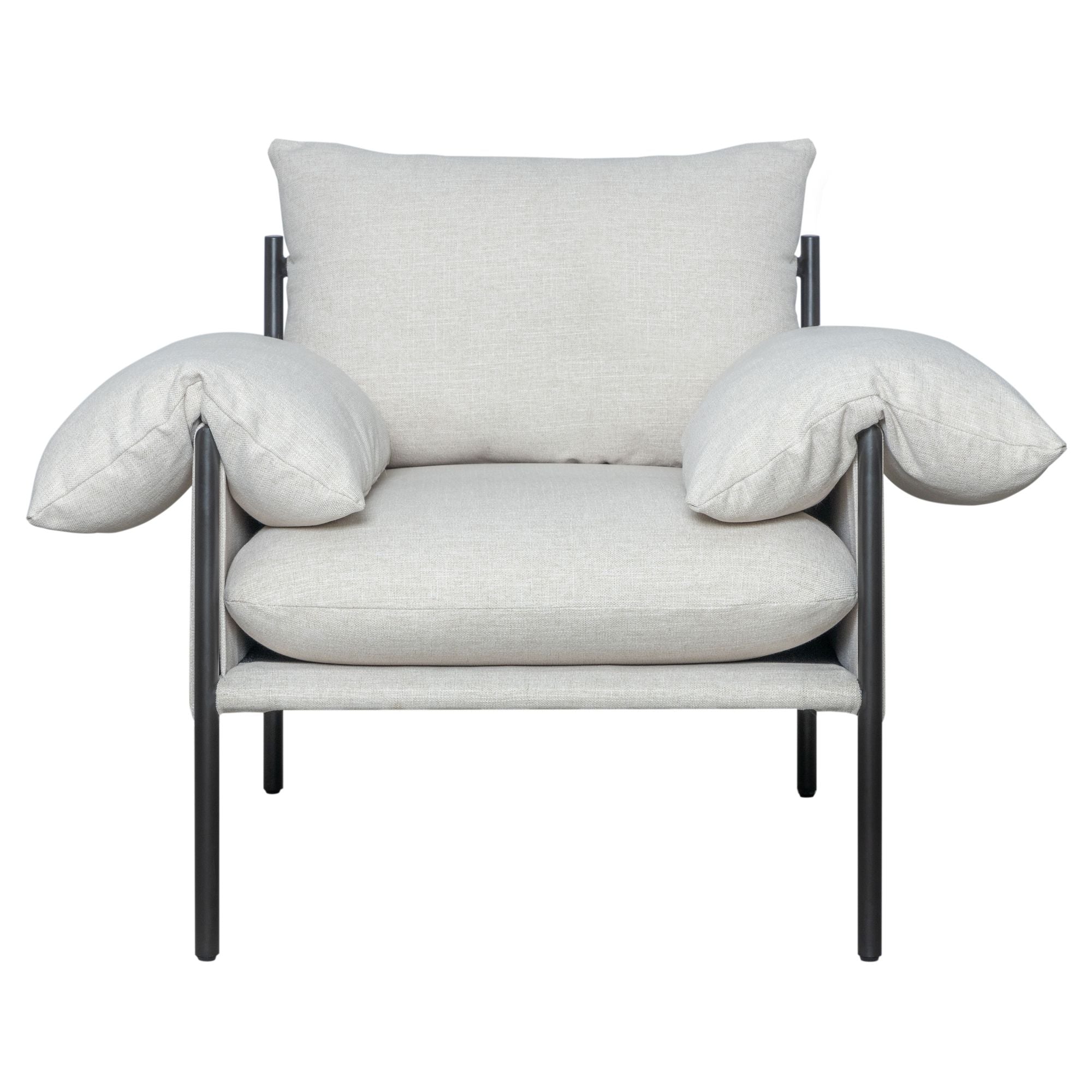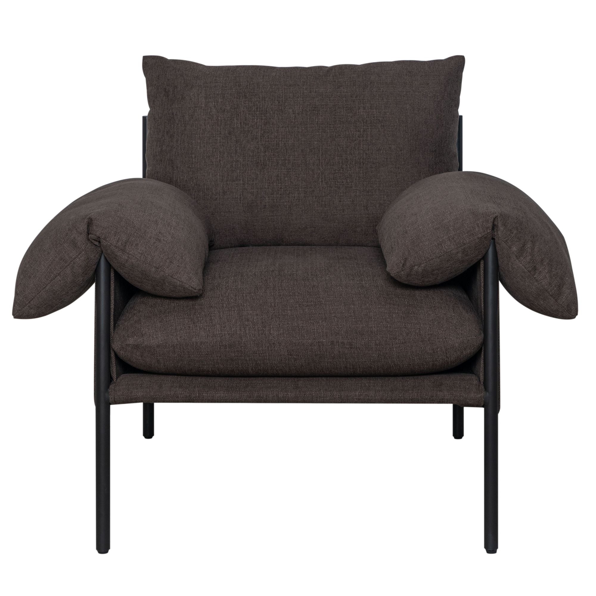 One of its standout features is the overstuffed, pillow-style arms that rest gently on an exposed steel frame. This thoughtful pairing of soft, cushioned comfort with bold structural lines creates a visually interesting and stylish presence. The chair is grounded by a sturdy four-leg base constructed from a blend of steel and plywood, offering both stability and long-lasting performance.