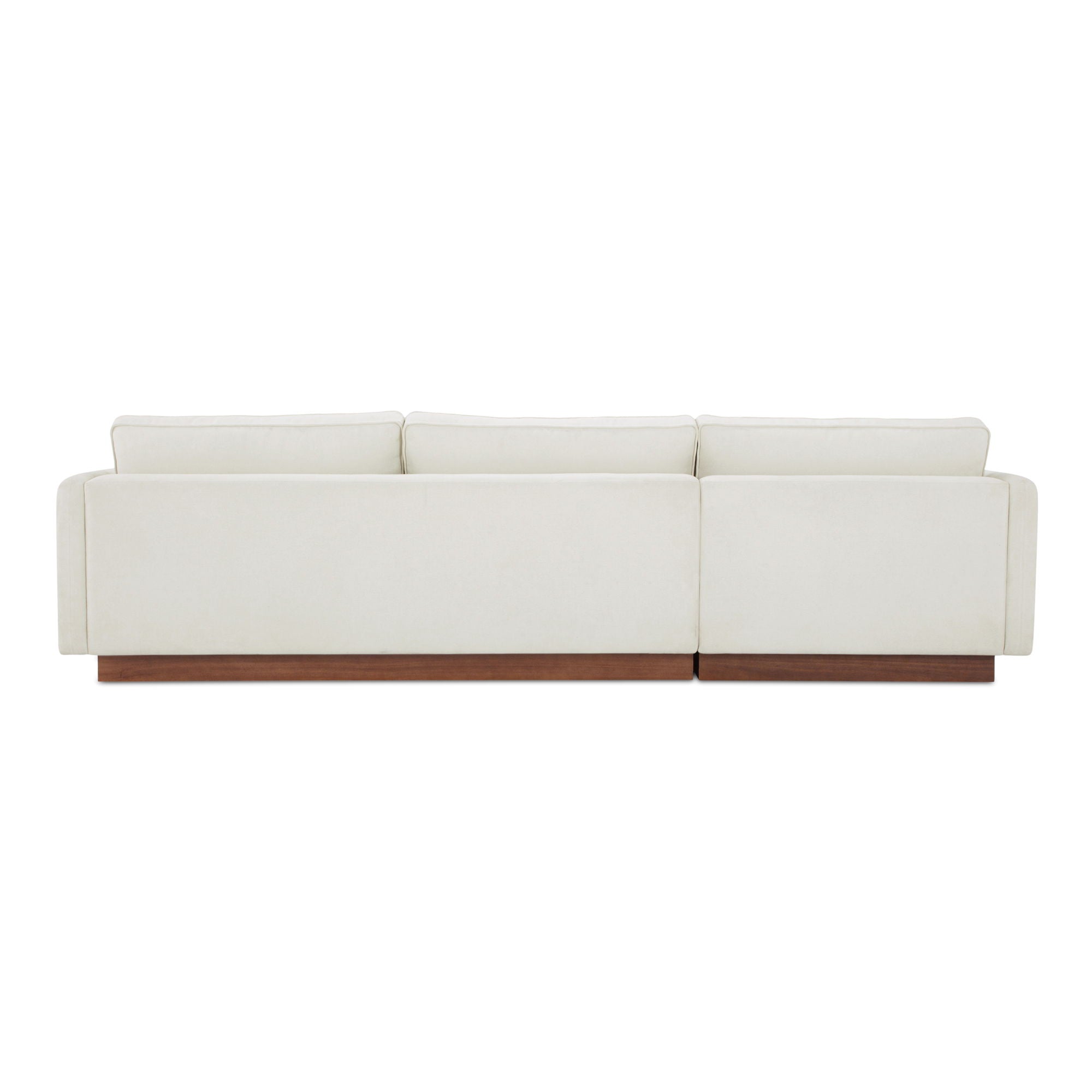 The Vernon sectional blends mid-century design with modern functionality. It features a wooden plinth base for an elevated, lighter appearance. This sectional offers unmatched comfort with removable cushions. Upholstered in durable, OEKO-TEX and Green Guard-certified fabric, it is ideal for family living, combining everyday practicality with durability.