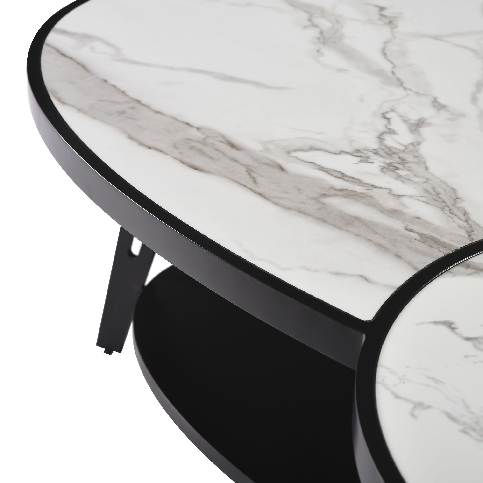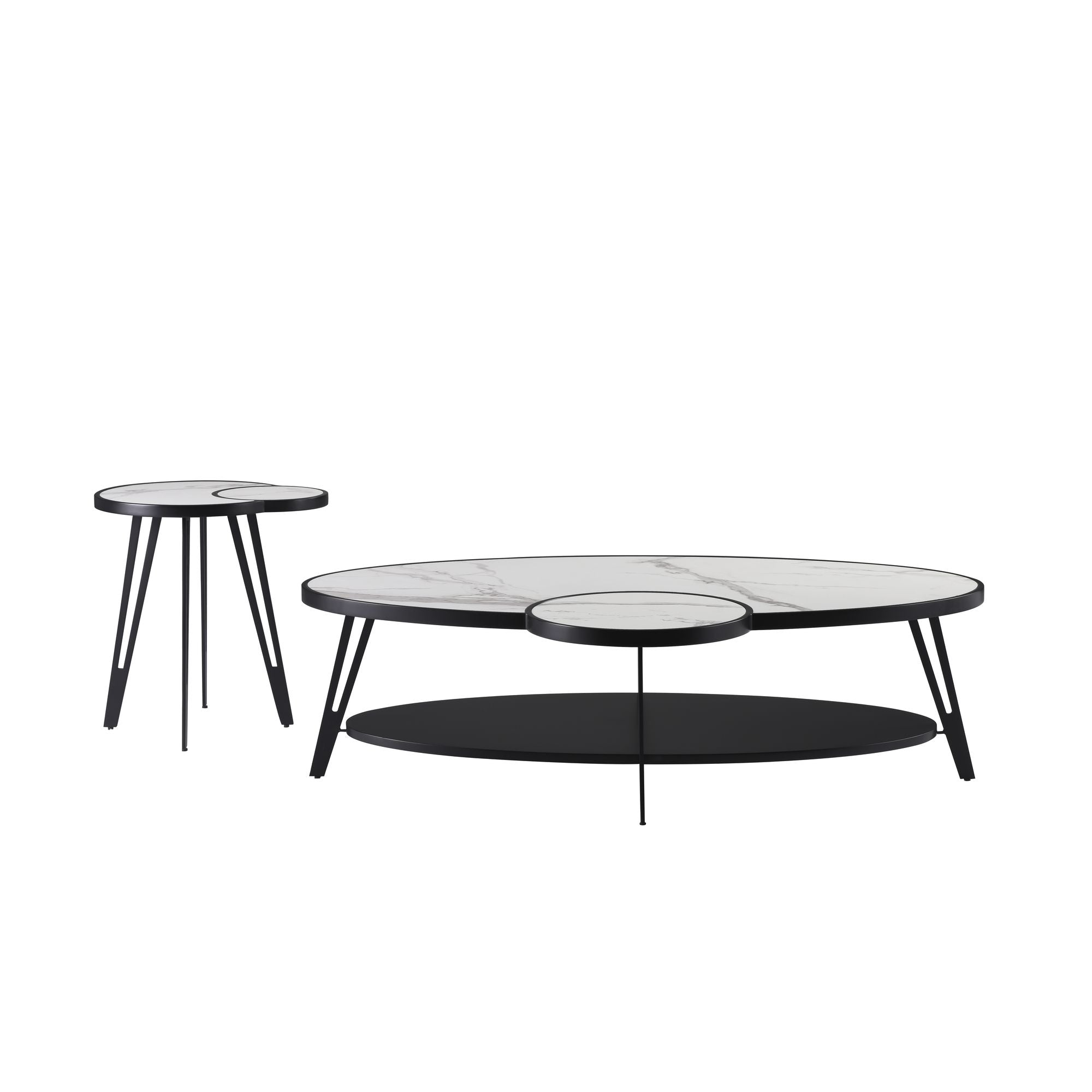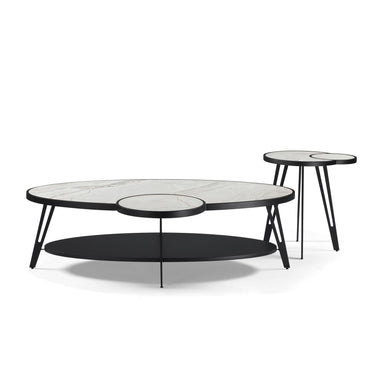 - Contemporary 2-piece oval coffee table set with veined white sintered stone tops and matte black flared legs ; sculptural silhouettes with minimalist appeal.
