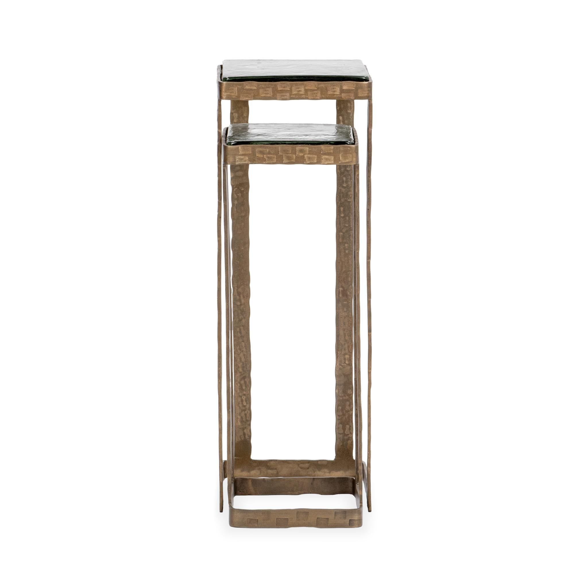 Add a touch of modern elegance with this set of nesting end tables, crafted from durable mild steel and topped with thick casted glass. The hammered gold finish and sleek silhouette create a striking look, perfect for contemporary living rooms, bedrooms, or entryways. Use together or separately as space-saving side tables, plant stands, or accent pieces that bring both function and sculptural style to your home decor.