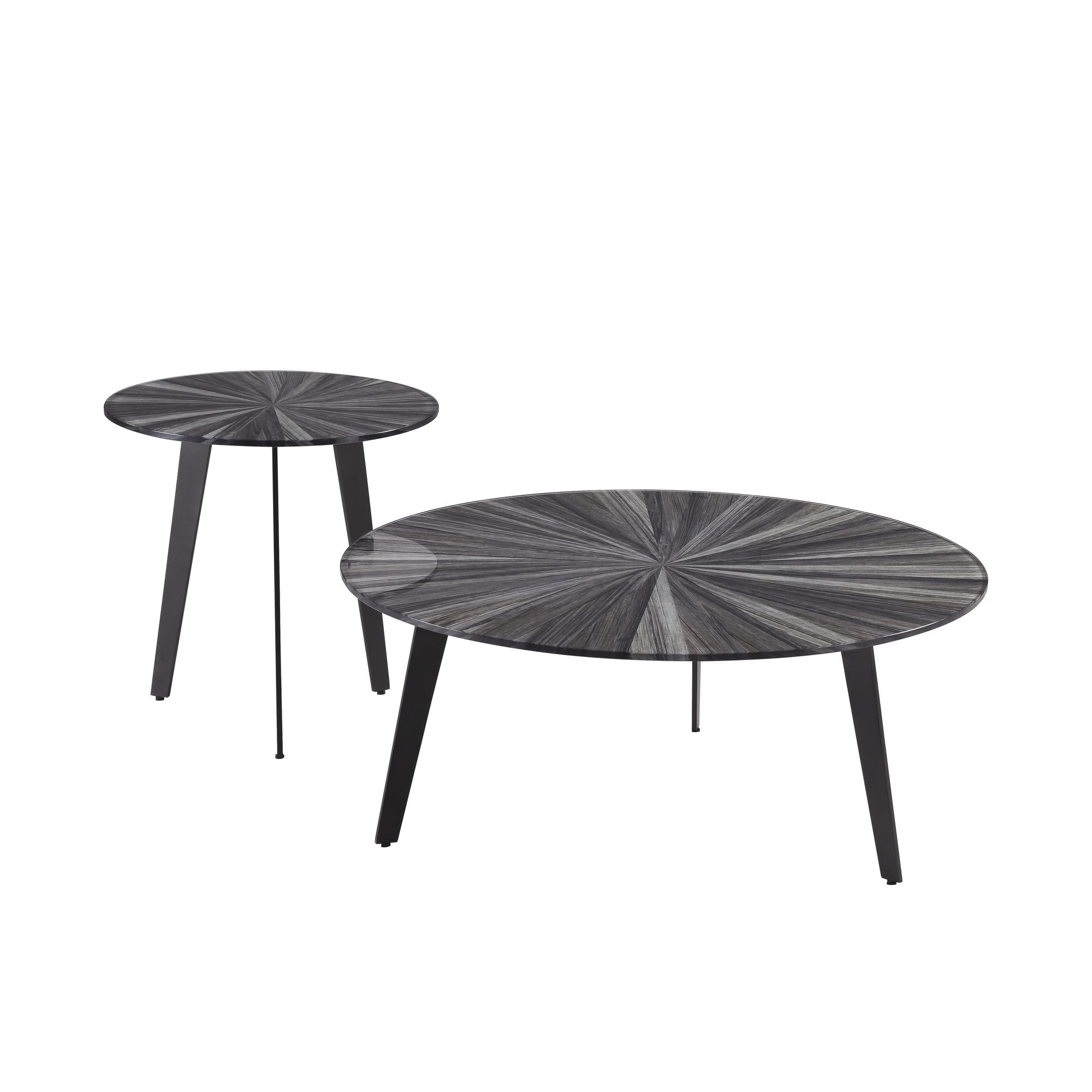 - Mid-century inspired 2-piece round table set with tempered glass tops and tripod metal bases ; perfect for layered or individual styling.