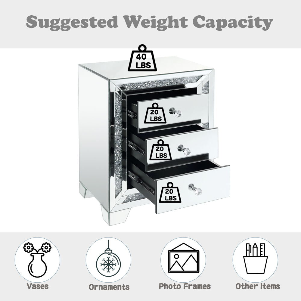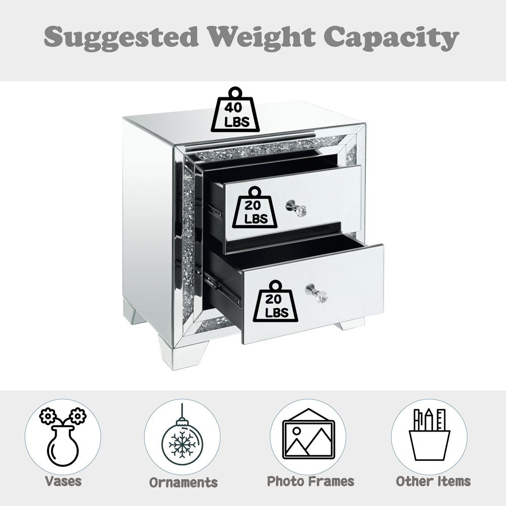 Assembled, Rectangular Night Table • Features: Mirrored Finish w/Faux Diamonds & Clear Glass, Mirrored Tapered Leg •• CONSTRUCTION •• Mirrored Case Frame: 4mm Beveled Mirror, MDF; TRIM]: Faux Diamonds Inlay, 4mm Clear Tempered Glass • Mirrored Tapered Leg • Drawer: GLIDE Side Metal (2/3 Ext.), DOVETAIL French Front, Full Black Finish Inside (Felt NOT Included), Safety Stop Included, Manual Close, Hardware: Single Knob, Sparkling Faux Gem