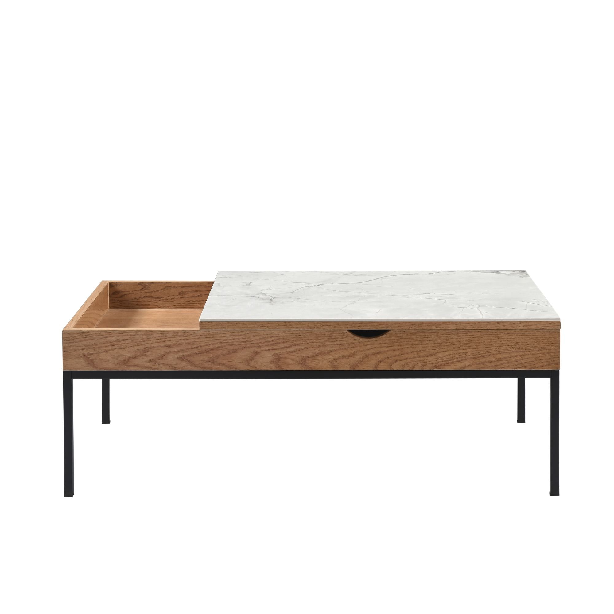 - Rectangular lift-top coffee table with sintered stone panel, wood frame, and black metal base ; built for daily function with a designer finish.