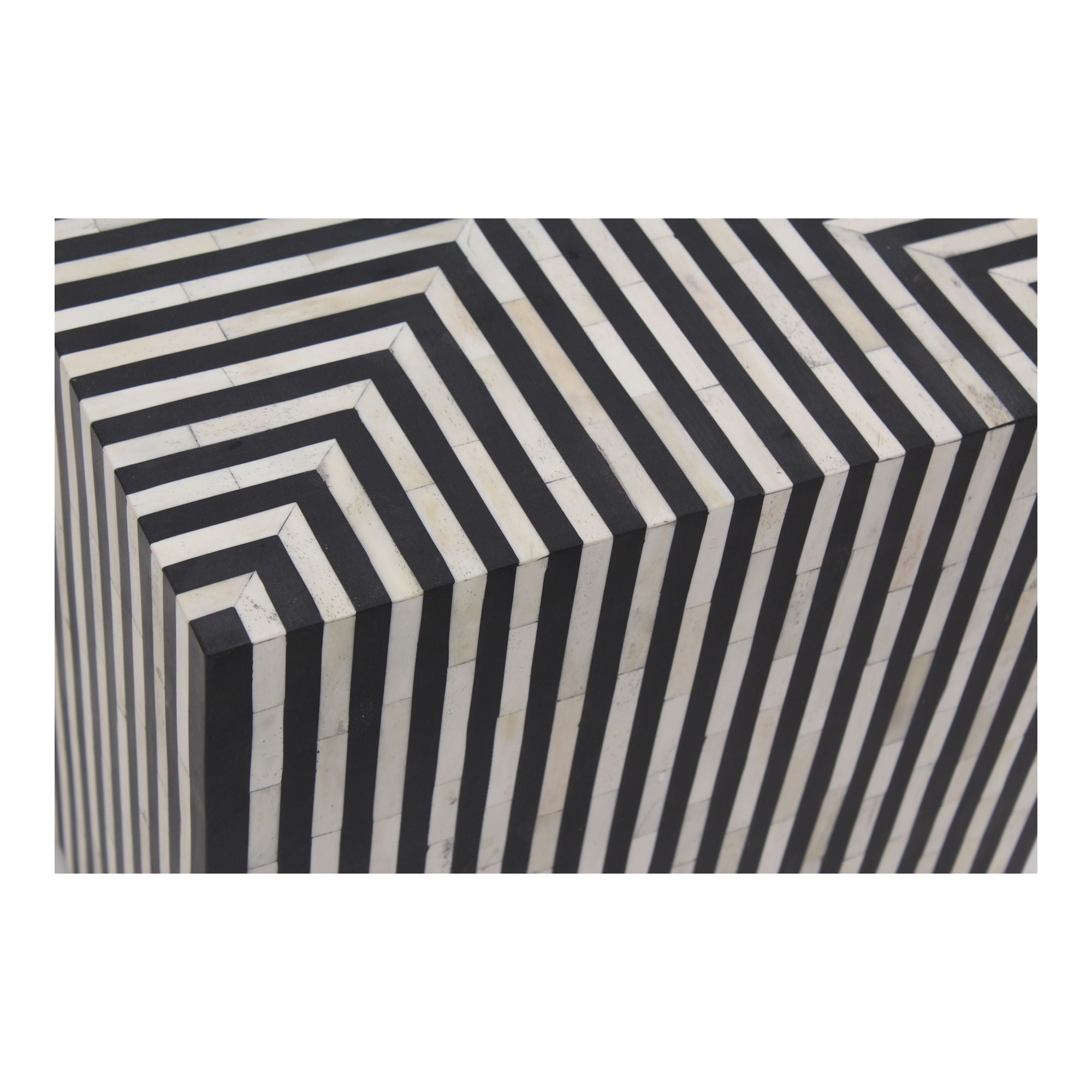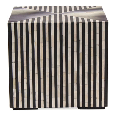 Simplistic and bold, the Terning side table’s hypnotic art deco design is an exercise in contrast. A veneer of ethically sourced white and black camel bone with resin adds a visual statement that contrasts with its simple construction and square shape. The Terning series features a coffee table and a side table to better suit living spaces of all sizes and shapes.