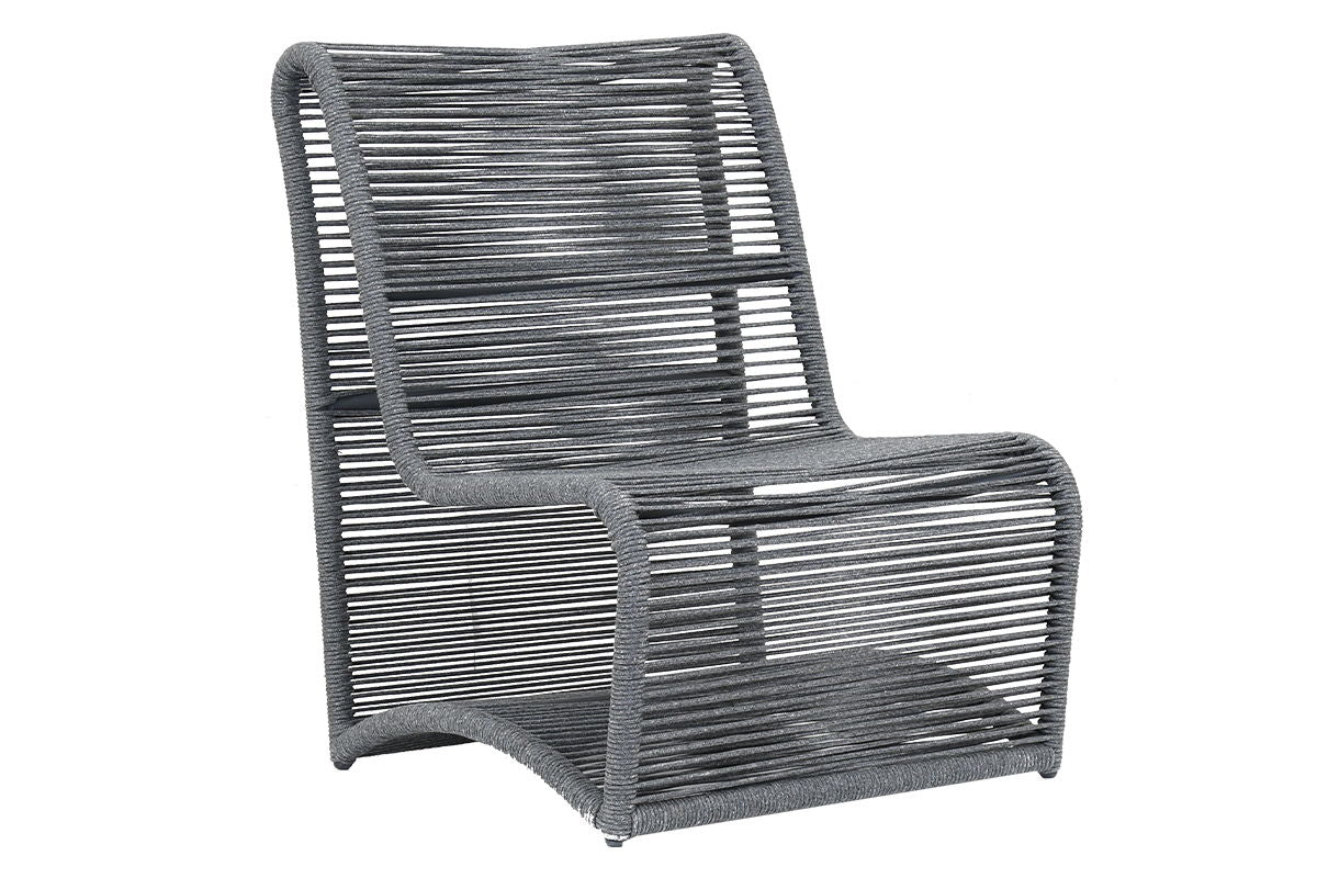 The Milano Armless Club Chair steps outside of traditional outdoor furniture design boundaries to deliver a winning combination of both whimsy and refinement. Featuring an open frame, The Milano is engineered for equal parts comfort and style: the striking silhouette is crafted with thoughtful curves and a premium olefin rope design to provide ultimate support and statement. Wrapped in weather-resistant, colorfast outdoor rope in Slate Milano is part of the Slate color story, and pairs well with Redondo, Granite occasional and fire tables, and other items from the Bazaar.