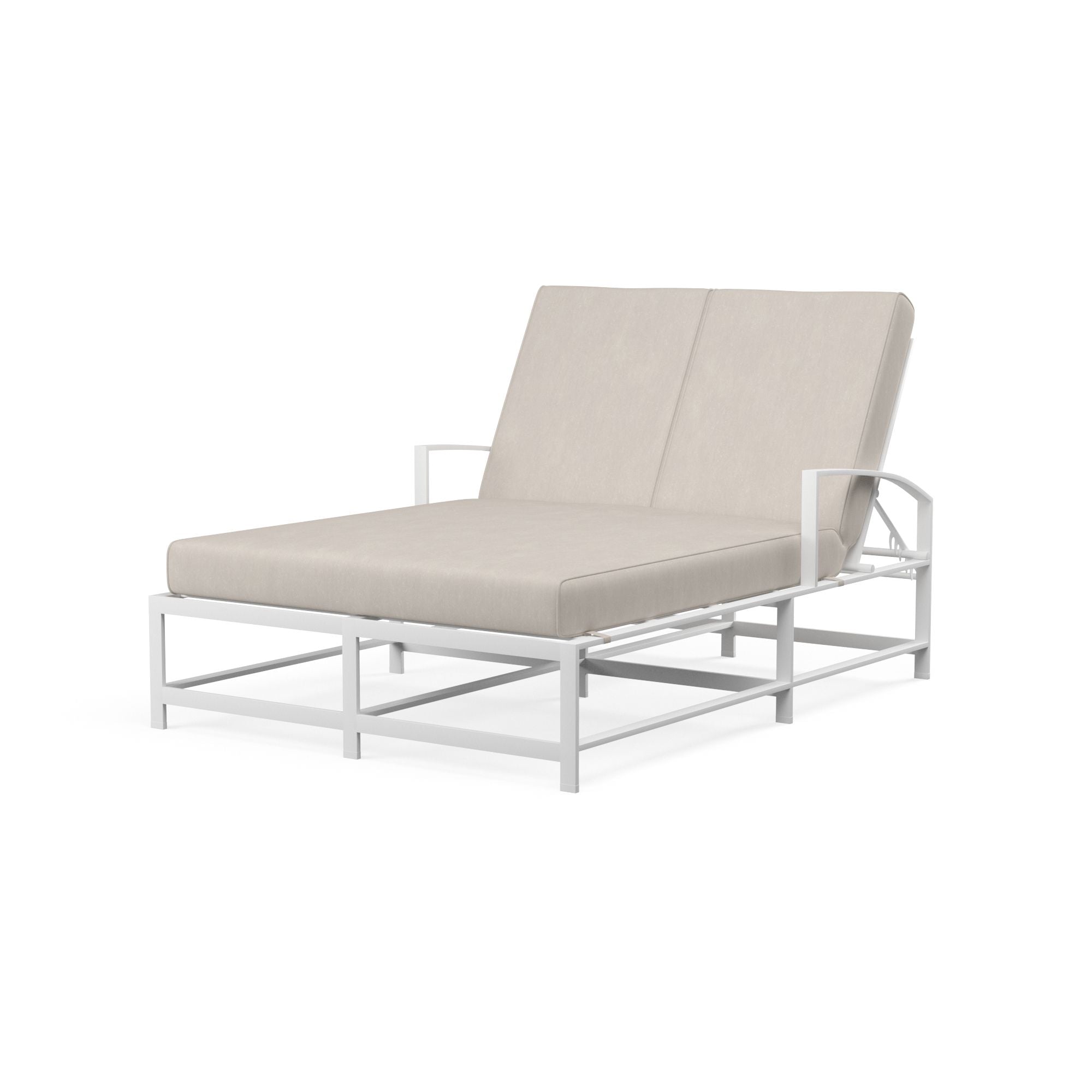 Sunset West's transitional Bristol Double Chaise is rendered in high quality, low-maintenance aluminum that will stand the test of time. This lounger features a gently curved X back and seat scaled for comfort, with straight channel legs and subtly curved arms. Adjustable back offers 5 positions for customized lounging for two. - Fully welded, scratch-resistant powder-coated aluminum frame in Frost White finish - Weather resistant, high-resiliency foam cushions - Stocked in Premium Sunbrella fabric in Canvas Flax - Commercial Quality Construction - Custom Cushions available in approx. 4 weeks