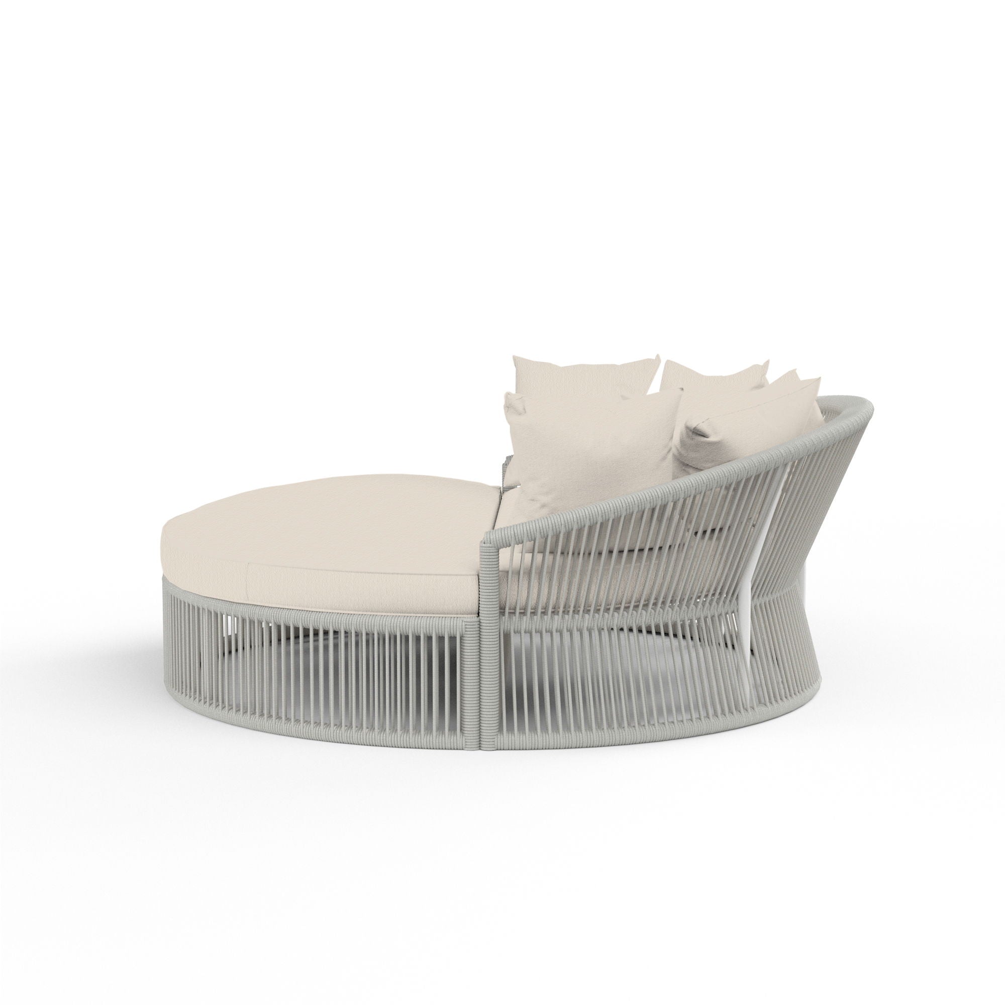The Miami Daybed embodies clean lines and thoughtful angles with its curved frame and striated rope design. Its rust free aluminum frame is expertly hand wrapped with premium all-weather olefin rope in a silver-grey, with plush 6" cushions and included back throw pillows for ultimate relaxation.
