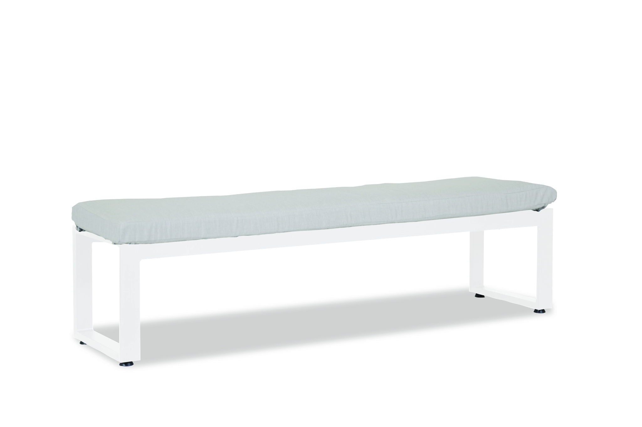 The Newport Dining Bench blends modern and industrial sensibility into one striking design, featuring a slat seat and linear frame. Crafted in powder coated aluminum in a Satin White finish, this bench pairs perfectly with our Newport 90" Dining Table. Fully welded, scratch-resistant powder-coated aluminum frame Optional Cushion Stocked in Premium Sunbrella fabric in Cast Silver Adjustable Non-Marring Feet Commercial Quality Construction Custom Cushions available in approx. 4 weeks. Newport is part of the Frost color story, and coordinates well with Miami, Naples, and Carrara pieces from the Bazaar.