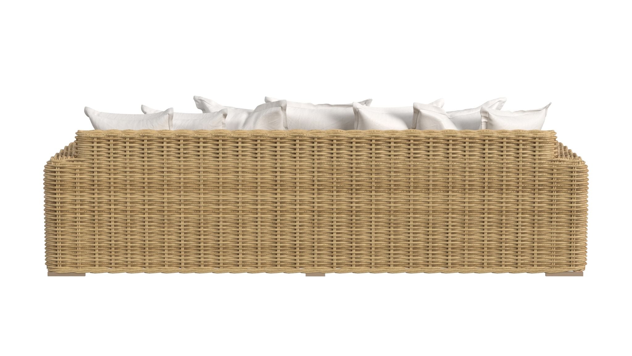 Sunset West's Playa Large Sofa features deep seating with an oversized frame and track arm for sumptuous comfort. Sink into its plush pillow cushions for luxurious relaxation. Crafted with Resin wicker in a Natural finish, bring a tropical feel to any outdoor space.