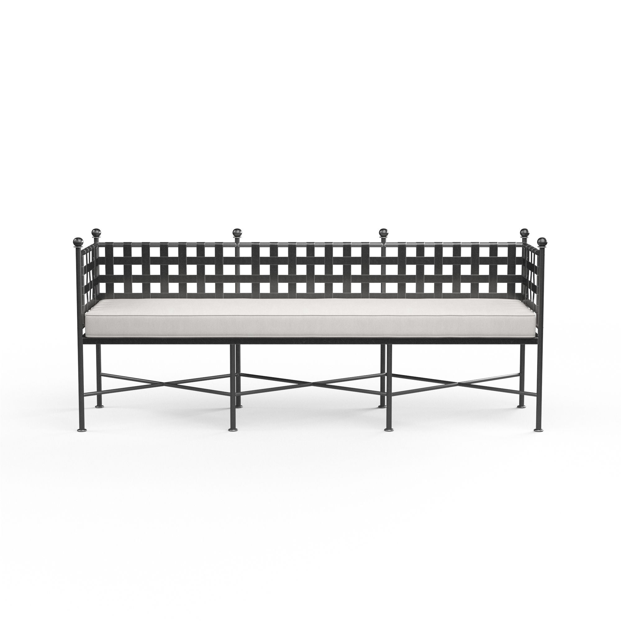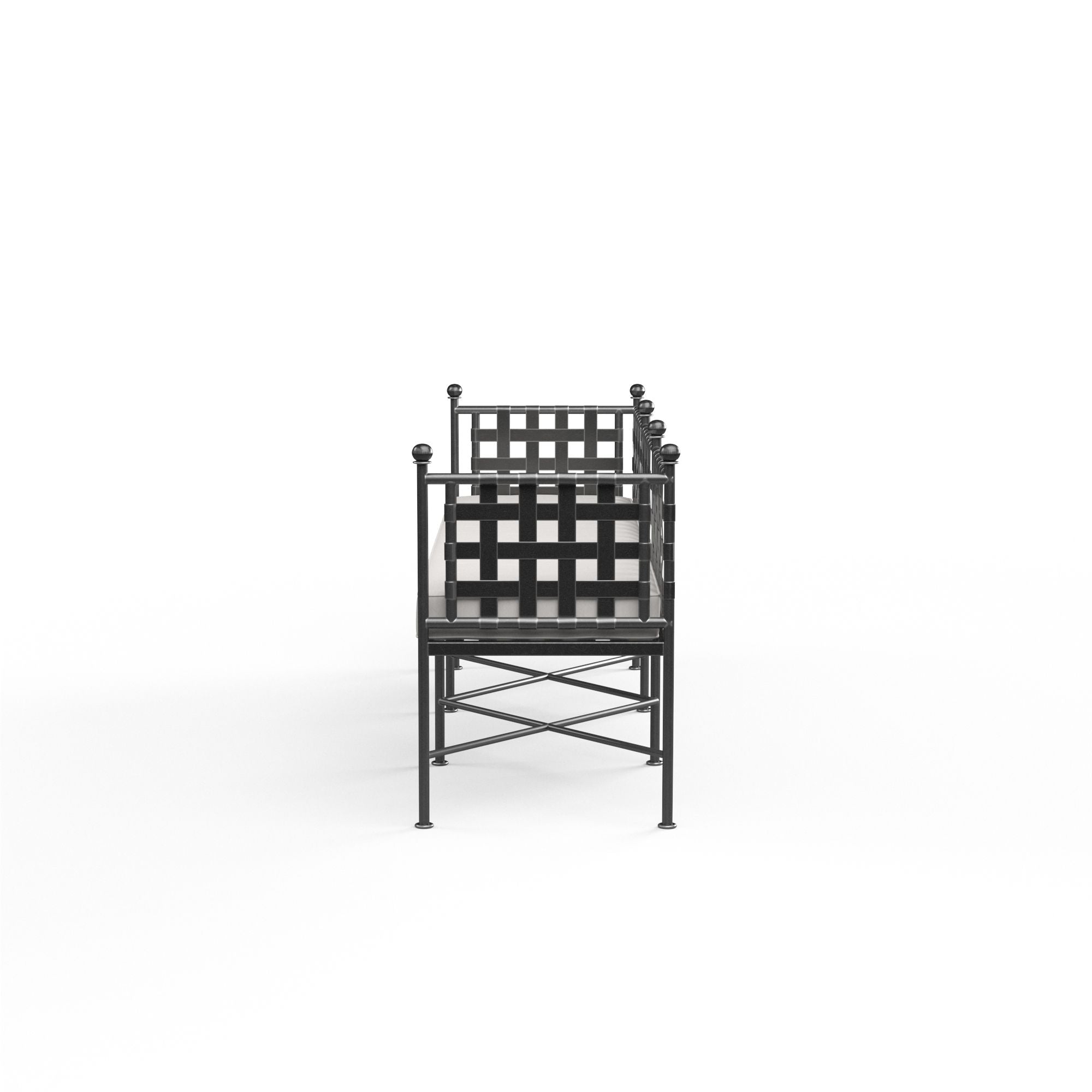 Constructed in expertly crafted wrought iron, the Provence Bench displays a woven basket weave frame, and subtly brushed Century Pewter antique finish topped with well-dressed finials. Featuring a 72" bench seat cushion, this piece is excellent for garden lounging, or paired with the Provence Dining Table.