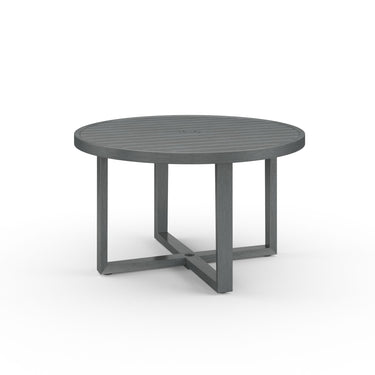 The Redondo 50" Dining Table blends modern and industrial sensibility into one striking design, featuring a slat table top and linear frame, crafted in powder coated aluminum in a hand-brushed Slate finish. Umbrella Hole Redondo is part of the Slate color story, and works well with Milano, Emerald, and natural Granite pieces in the Bazaar.