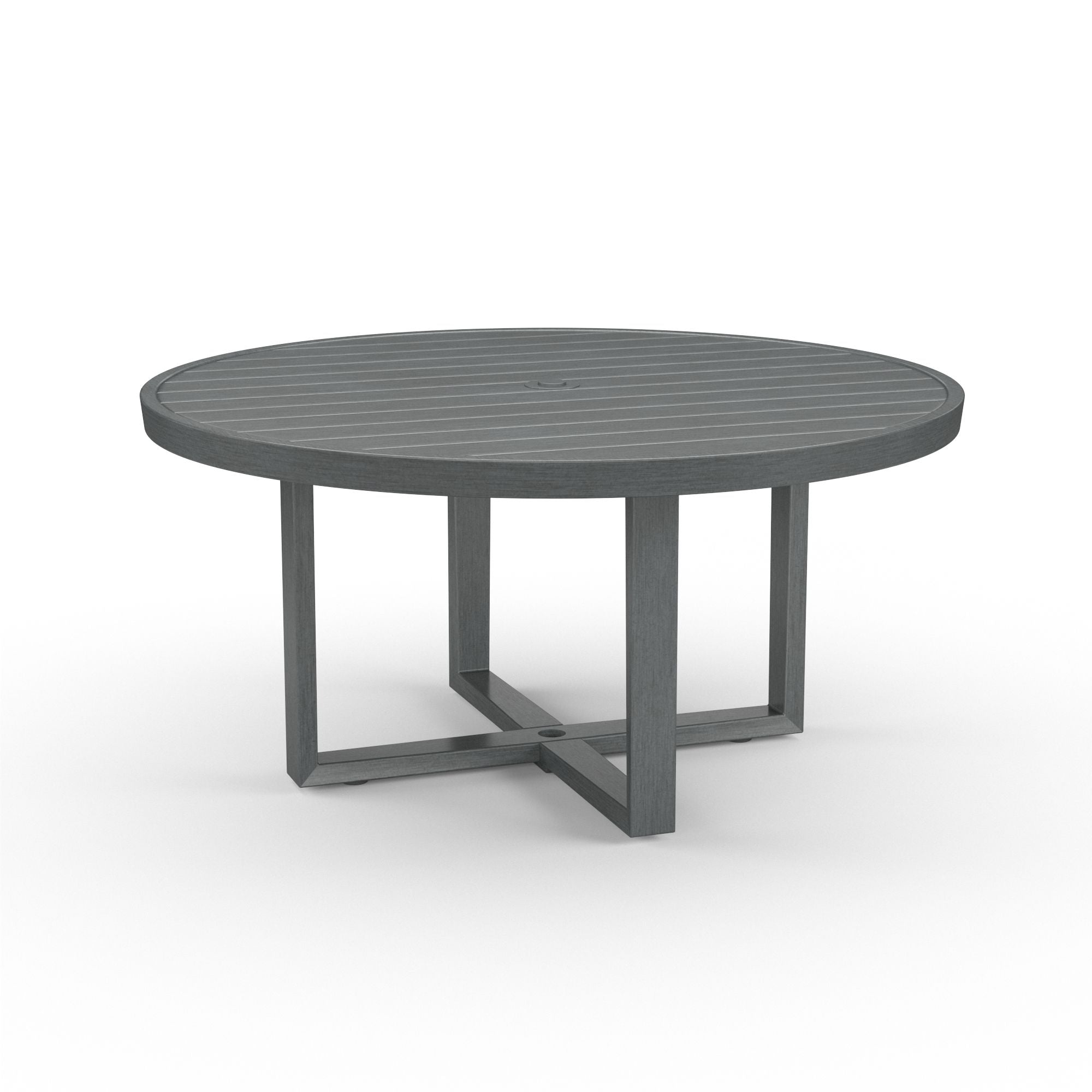 The Redondo 60" Dining Table blends modern and industrial sensibility into one striking design, featuring a slat table top and linear frame, crafted in powder coated aluminum in a hand-brushed Slate finish. Umbrella Hole Redondo is part of the Slate color story, and works well with Milano, Emerald, and natural Granite pieces in the Bazaar.