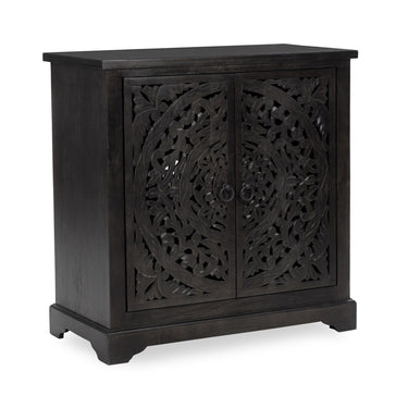 Elevate your space with this exquisite mango wood sideboard, featuring intricately hand-carved floral panels that blend artistry with function. The dark wood finish enhances its rich texture, while antique-style ring pulls add a refined touch. Ideal for entryways, dining rooms, or living areas, this artisan sideboard offers elegant storage with timeless charm. A perfect piece for those who appreciate craftsmanship, global design, and sophisticated statement furniture.