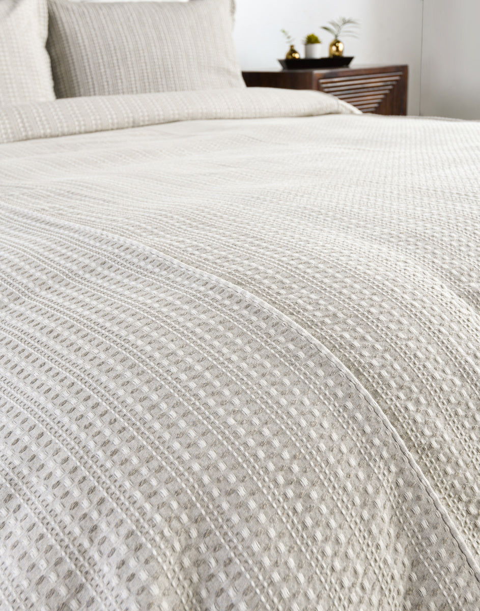 A simple striped waffle pattern provokes textures and depth in this cotton duvet collection. Perfect for layering, elevate a room with causal comfort and relaxed heirloom style. The hidden button closure provides a clean finished look while the corner ties allow for a secure insert without any shifting. Stonewashing a process where subtle variations in color and texture add to the unique character of each individual bedding item. For best results in color consistency, please order sets or order all components together. Bedding should be washed in cold water with mild detergents that do not contain bleach or other whiteners using a large capacity washing machine. Tumble dry on a low heat seating and remove immediately to avoid wrinkles. Villa Bedding is prewashed before packaging to avoid products from shrinking and stiffening. Our Cotton and Linen products become softer with every wash.