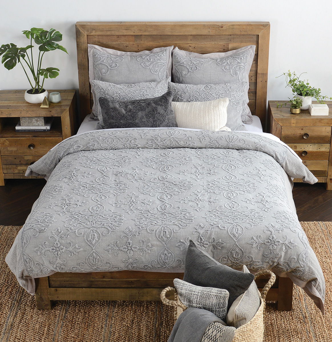 The Reagan Collection is accented with intricate hand-stitched embroidery and stonewashing adding design and style to this luxury bedding collection. With subtle distressing and thoughtful hand detailing, this irresistible collection will elevate the drama of a bedroom. A hidden button closure provides a clean finished look while the corner ties allow for a secure insert without any shifting.