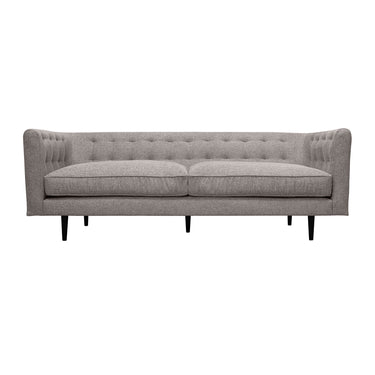 Give a chic and glamorous update to your living space with our Annabelle Fabric Sofa with Black Wood Legs. The clean lines and sophisticated details of the couch lend a modern and elevated edge to any room. A stunning tufting detail upon the back and arms lend a dose of charm and elegance. Elevated upon cylindrical wooden legs to attain a modern and airy profile, the Annabelle brings traditional chesterfield and modern style themes together. The sofa features a sheltering silhouette and generously padded arms to ensure a comfortable stay. Completed with boxy and generously cushioned seats, the sofa invites you to sink in and relax. It remains an ideal piece for anchoring your family room, man cave, den, or formal living space. Allowing you to entertain in style, our sofa offers a plush respite for your family and friends. It is available in a variety of materials and finishes to create the perfect look for your home.