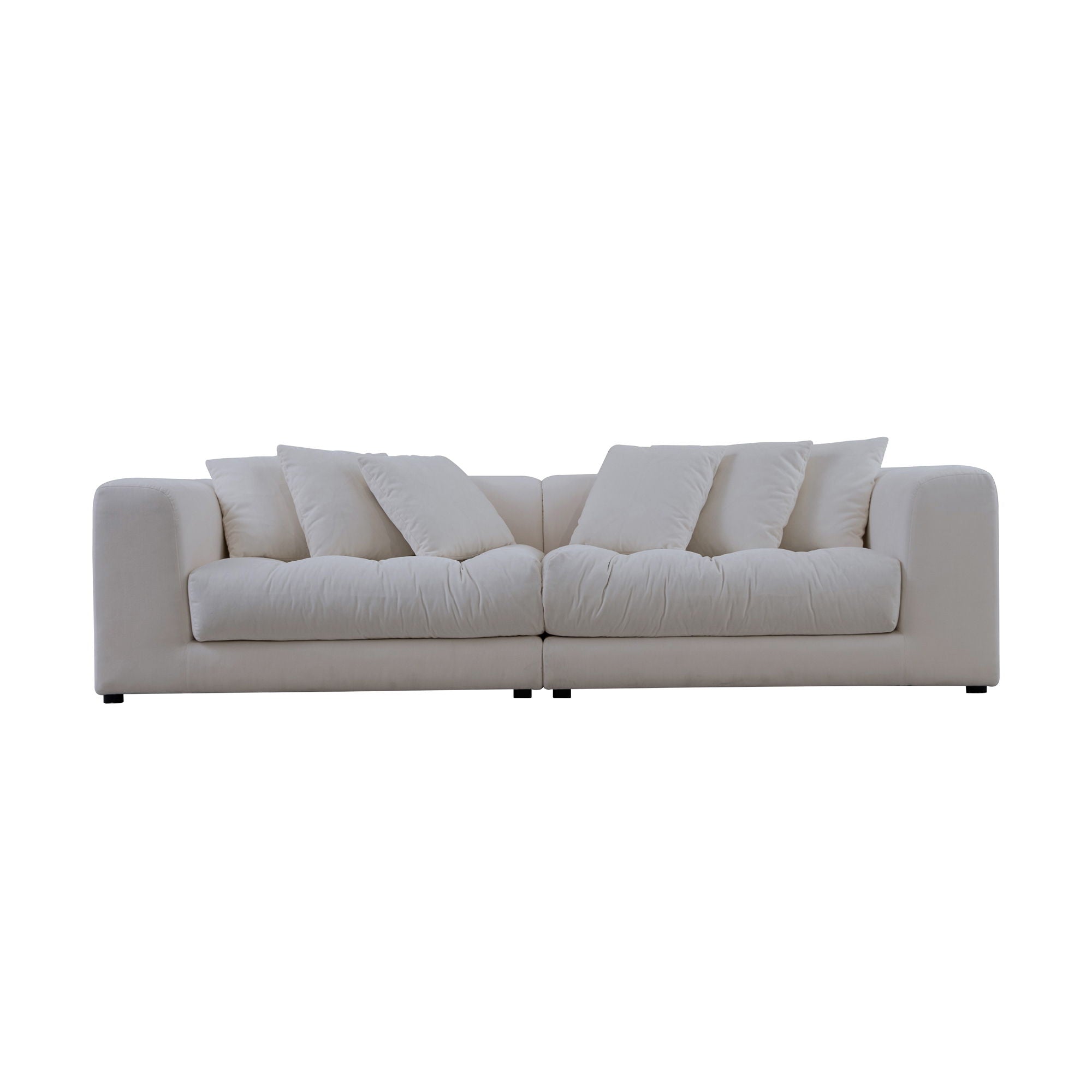 The Davie Sofa's generous scale and deep seat invite serene relaxation. Tufted seat cushions adorned with feather and fiber toppers create a plush landscape made for lounging. The two-piece sofa in velvety soft upholstery offers a flexible arrangement as six loose back pillows create personalized comfort.