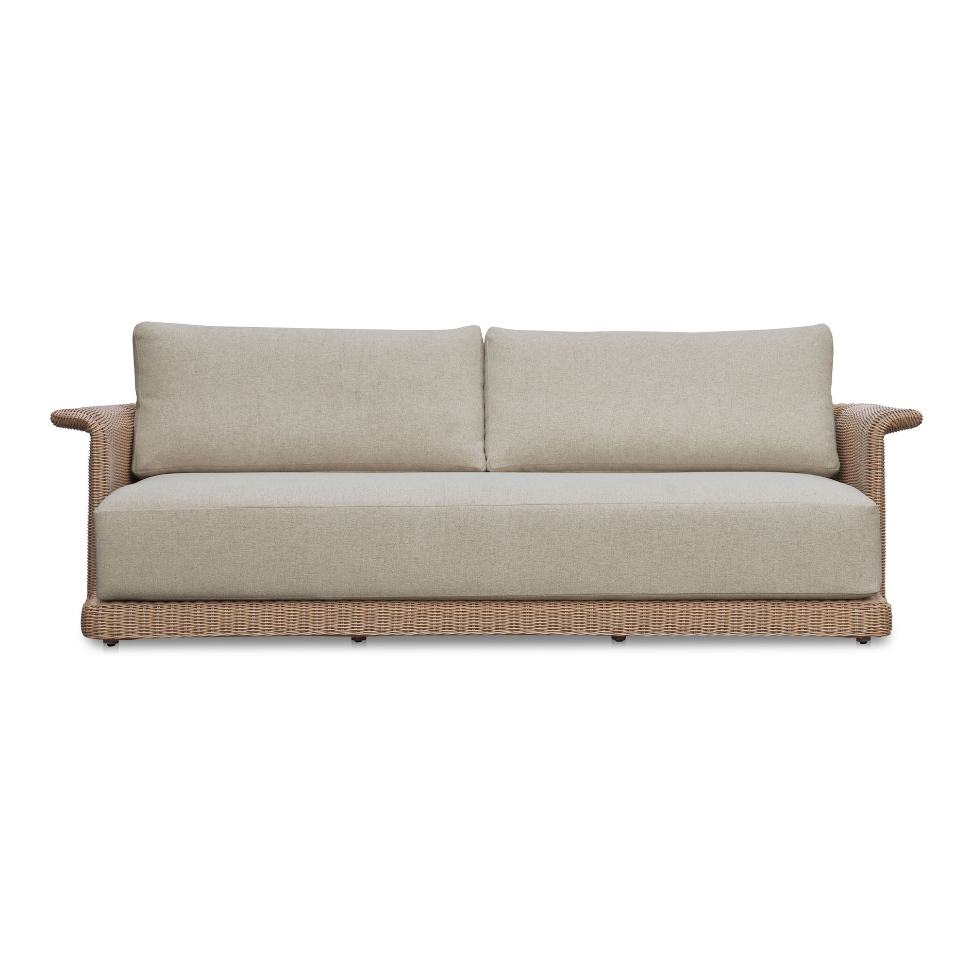 The Meredith sofa's graceful tulip silhouette and curved armrests create visual interest, while generous cushioning offers indulgent comfort. Artfully woven synthetic wicker over an aluminum frame marries durability with aesthetic appeal. Quick-dry foam and Dacron fiber ensure lasting resilience, while the sophisticated hue complements various exterior designs.