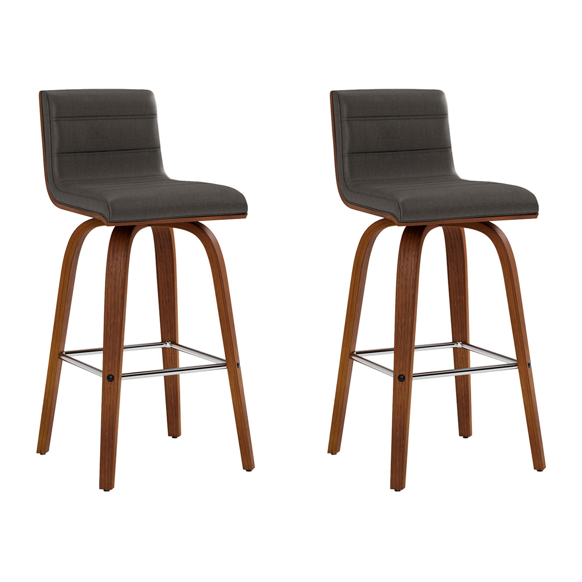 Elevate your space with the classic and sophisticated Vienna Swivel Faux Leather and Wood Counter or Bar Stool by Armen Living. This sleek and versatile barstool seamlessly combines style and comfort with its Mid-Century Modern design, effortlessly integrating into your home's existing decor. With the 360-degree swivel function, you and your guests have optimal mobility for staying engaged, regardless of your place in the room at any party and gathering. The sturdy frame is constructed with four robust wooden legs, elegantly accentuated by a plush, high-density foam cushion enveloped in high-grade faux leather upholstery. A square, steel footrest adds a touch of chic style without compromising practicality. The soft faux leather upholstery makes the Vienna and ideal choice for any entertaining home! With its two seat height options and armless design, you can the Vienna easily complements your kitchen island, peninsula counter, or home bar. The padded backrest, designed with ergonomic properties, ensures both comfort and proper alignment during use. Ideal for any home or apartment, the Vienna promises enduring comfort with its quality materials, guaranteeing a stylish and comfortable seat for years to come. Choose from the Vienna Counter or Bar Stool in 26” or 30” seat height, available in either a black wood finish with gray faux leather or a walnut wood finish with cream, gray, or brown faux leather to suit your individual taste and enhance your space.
