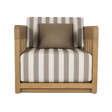 The Adelaide outdoor accent chair infuses the outdoor space with vintage-inspired charm. This contemporary accent chair features a solid teak frame and quick-dry foam cushions upholstered in 100% Olefin fabric. The brown and white striped cushions, accented with a solid tone toss pillow, create visual interest without overwhelming. The curved windowpane detailing nods to vintage designs while maintaining a modern aesthetic.