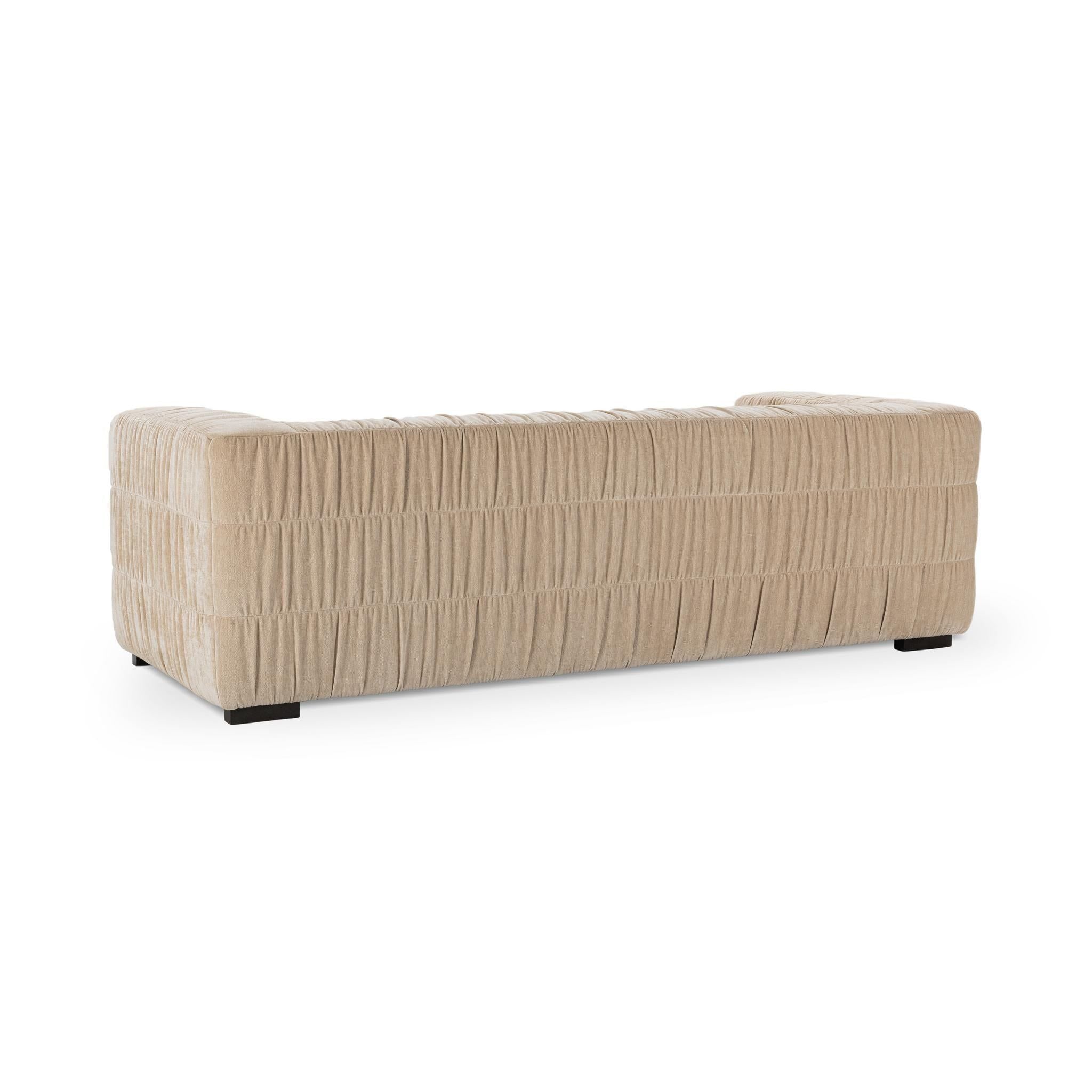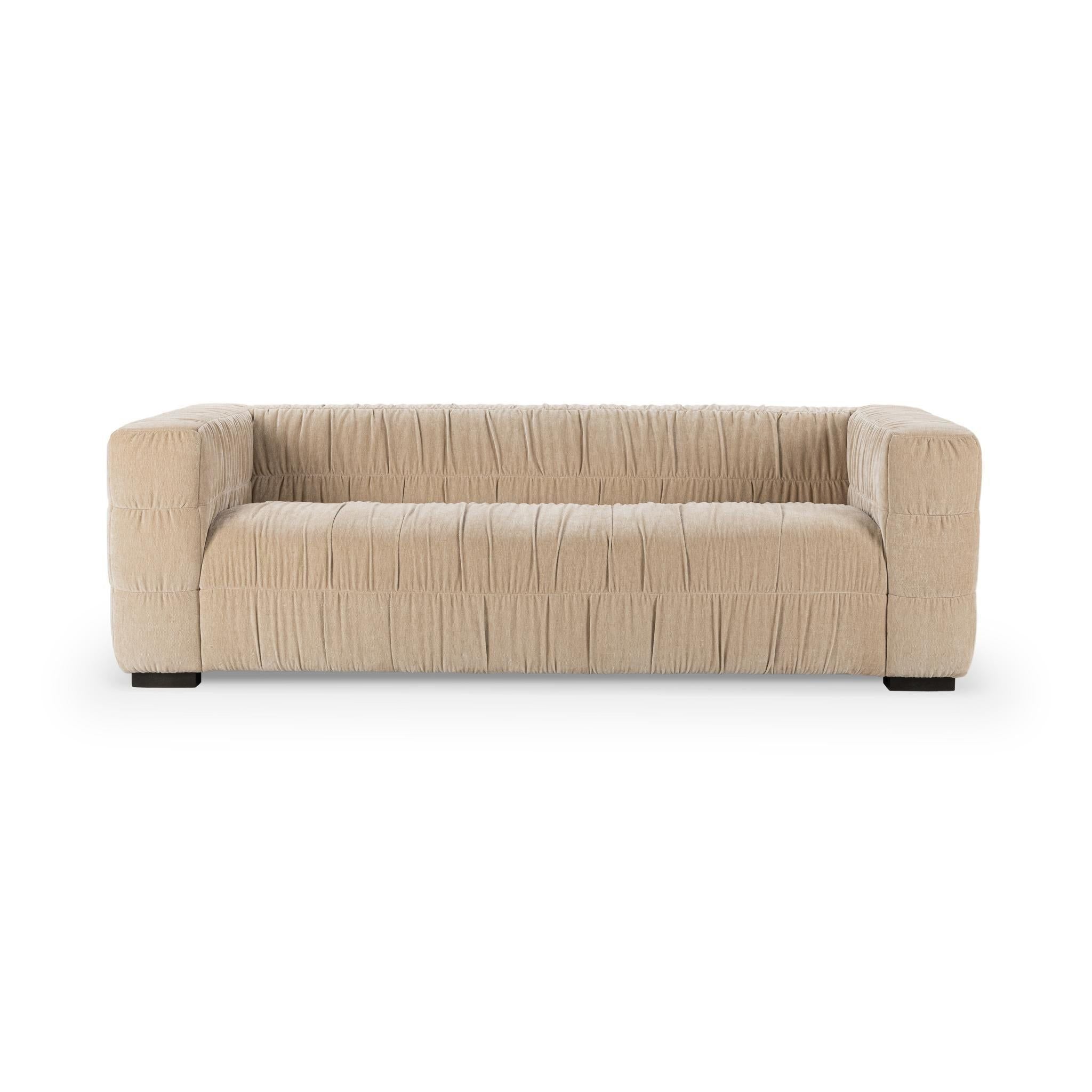 Designed to impress, our Afeela Sofa pairs bold structure with soft, ruched upholstery. Wrapped in 100% polyester and supported by rubber wood, it’s a perfect blend of comfort and modern artistry. Sink in and let luxury embrace you. Available in Bronze, Fern Green and French Vanilla.