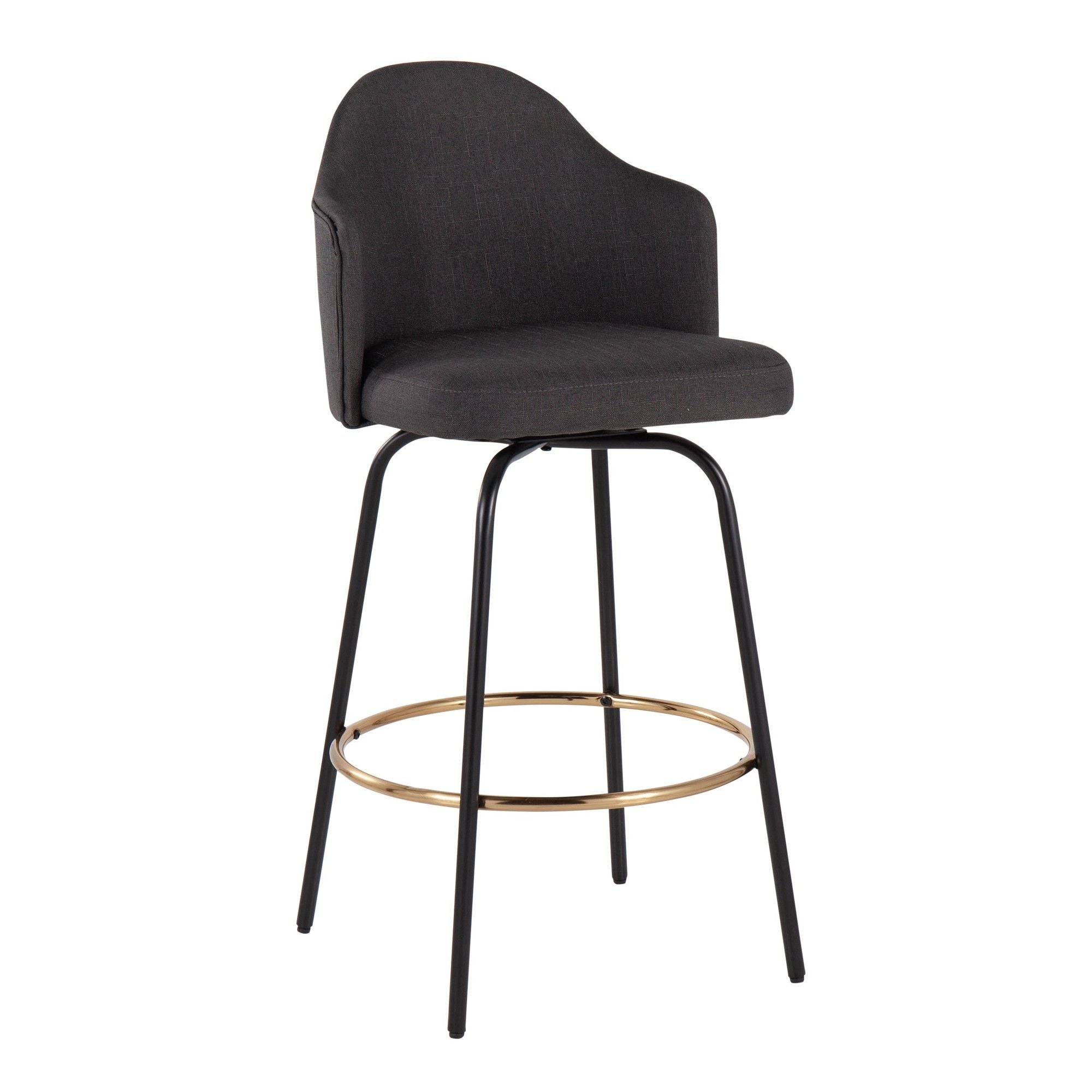 Ahoy - Fixed-Height Counter Stool (Set of 2) - Black Metal Legs And Round Gold Metal Footrest With Charcoal Fabric Seat
