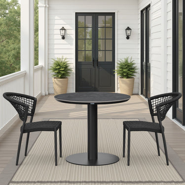 Bring sculptural elegance and modern durability to your patio with the Clarke & Kobalt Outdoor Dining Sets, offered in both 3-piece and 5-piece configurations. Designed for stylish entertaining and everyday use, these sets blend bold architectural details with textural coastal charm. At the center is the Kobalt 36-inch Bar Table, featuring a sleek sintered stone tabletop with a contrasting edge and a matte black pedestal base. Its modern silhouette makes a striking statement while offering everyday functionality for drinks, dining, or casual gatherings. Pairing perfectly with the table, the Clarke Outdoor Dining Chairs combine a powder-coated black metal frame with handwoven black rope. The sculptural weave promotes airflow for comfort while adding depth and dimension to the design. Balancing lightness and strength, these chairs bring sophistication and comfort to any al fresco dining experience. Whether you choose the 3-piece set for intimate sunset cocktails or the 5-piece set for weekend brunch with friends, the Clarke & Kobalt Collection creates a modern, versatile outdoor setting that elevates your patio or balcony.