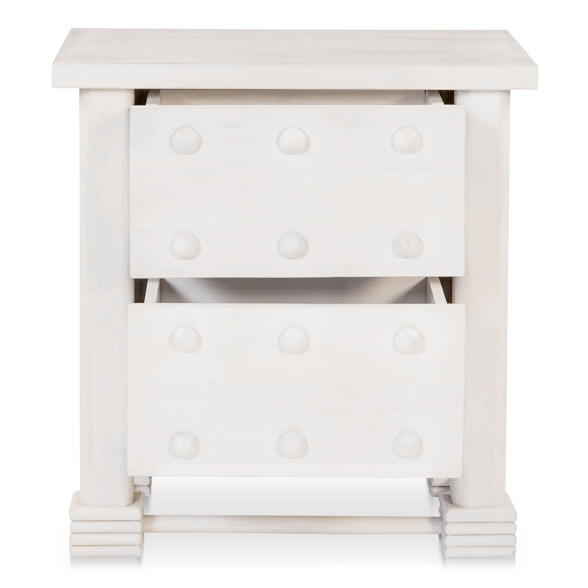 French-inspired elements and circular motifs enrich the Clement nightstand's oversized, chunky design. Crafted from mango wood with a whitewash finish, this ornate piece features carved detail feet with stretcher bars and drawer storage.