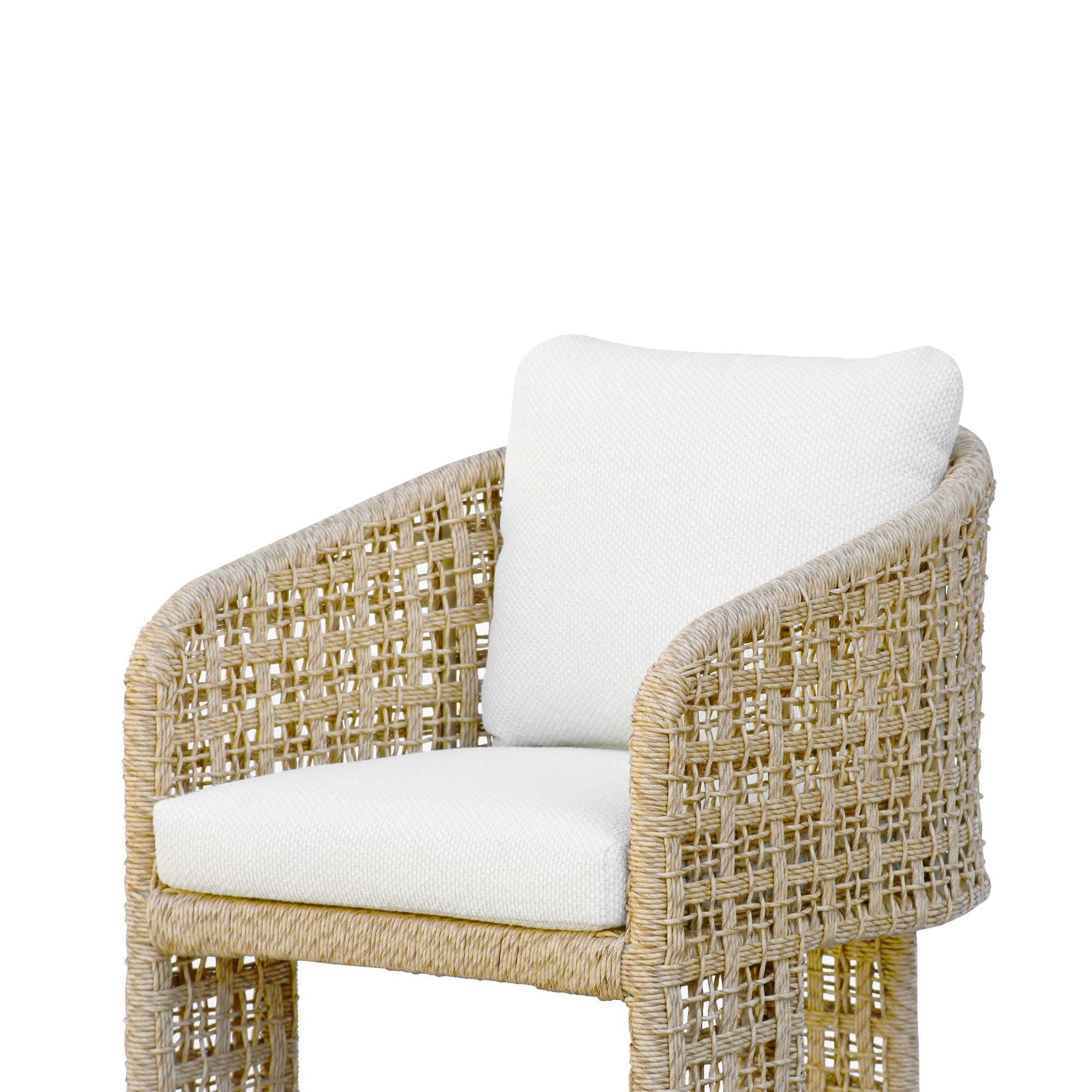 Refine your outdoor dining experience with the Driftbay Dining Chair. Featuring a natural woven rope frame and cushioned white boucle seat and back, it combines coastal textures with tailored comfort. Ideal for long outdoor dinners, this chair brings relaxed elegance to any patio or deck.