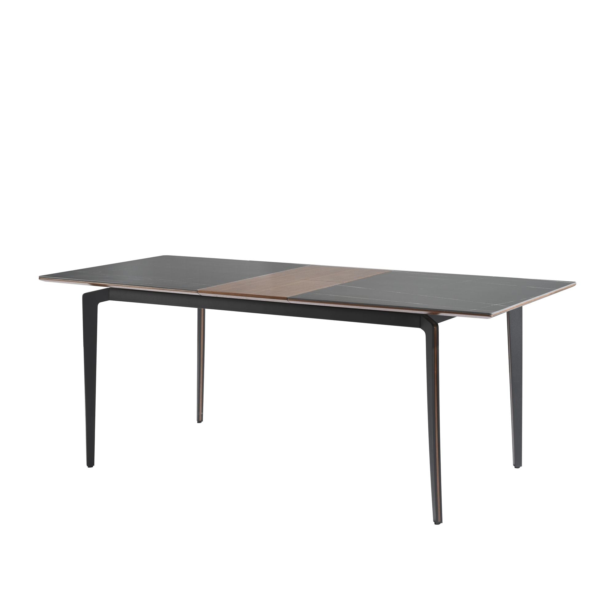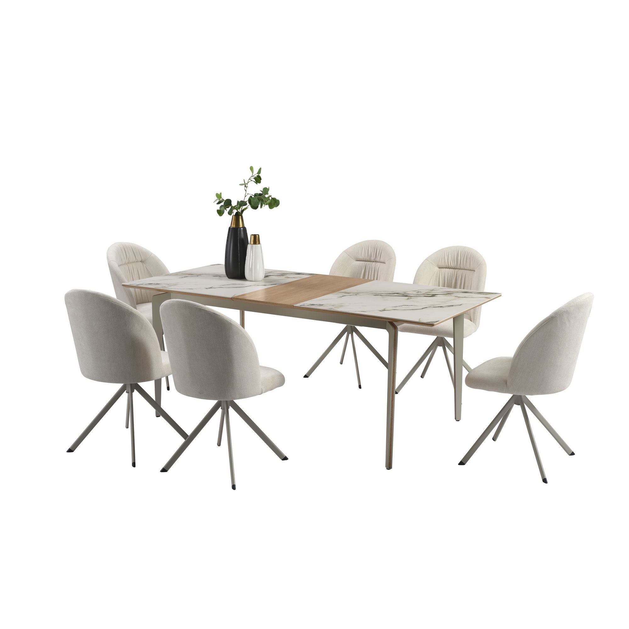 Refined design meets everyday versatility in the Honey Contemporary Dining Set — an elevated dining solution that adapts to your space and style. Anchored by the Honey extendable dining table, this set is available in two stunning finish combinations: sintered stone with dark wood tones, or sintered stone paired with light wood tones. Both options offer rich material contrast and modern appeal, making this collection an ideal choice for contemporary homes. The centerpiece dining table effortlessly extends from 63 to 79 inches, providing ample space for everything from weeknight dinners to special occasions. Designed with convenience in mind, the extension mechanism allows you to easily expand the table without needing to store a separate leaf — even when one hand is occupied. The smooth, seamless motion ensures quick transitions for unexpected guests or last-minute gatherings. Its sintered stone surface is engineered to resist heat, scratches, and stains, while the wood accents add warmth and depth to the tabletop design. Subtle veining on the stone top mimics the elegance of natural marble without the maintenance, delivering lasting beauty with functional durability. Sleek powder-coated metal legs with clean, tapered lines support the frame, giving the table a grounded and architectural presence in any dining area. Surrounding the table are six Hallie swivel dining chairs, available in complementary upholstery options: bold black legs with warm Almond fabric for the darker set, and light Champagne legs with soft Cream upholstery for the lighter version. These armless chairs feature curved backrests that follow the natural line of the spine, providing ergonomic support and a plush, foam-cushioned seat for extended comfort. The 180-swivel mechanism enhances flexibility and ease of movement — perfect for dynamic layouts and open-plan living. Whether you prefer the bold drama of dark finishes or the airy elegance of light tones, the Honey Dining Set delivers a cohesive look, luxurious feel, and adaptable design. With minimal assembly and all tools included, this set blends modern craftsmanship with long-lasting comfort for everyday dining that feels anything but ordinary.