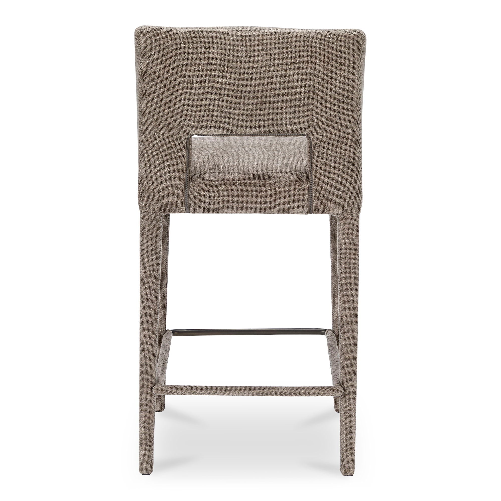 Fully upholstered in light brown performance fabric, the Joyce counter stool's cohesive silhouette exudes sophistication. The carved lower backrest adds visual lightness, while extended sides offer cradling support.