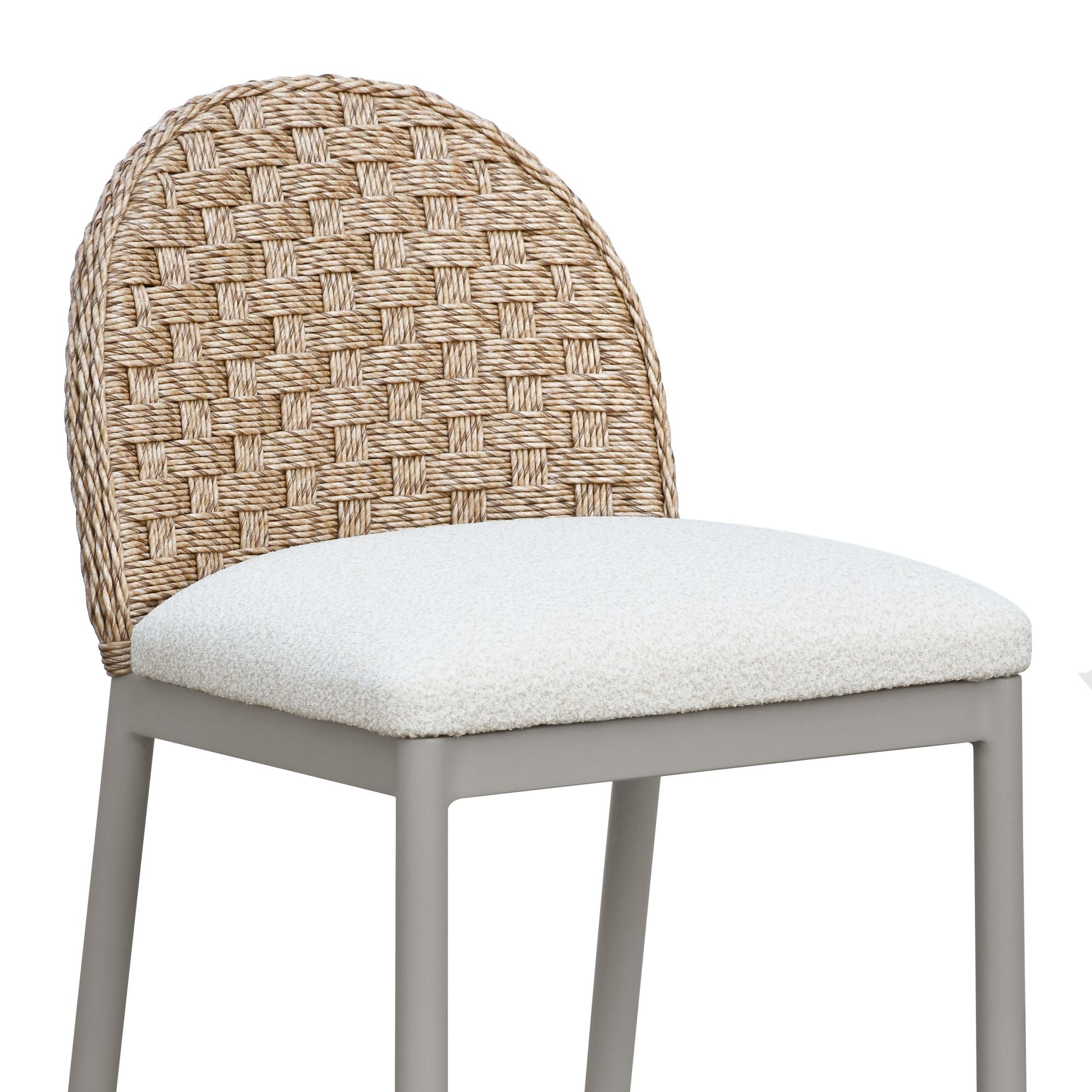 Bring coastal charm to your outdoor bar with the Kobalt Counter Height Barstool. Featuring a gracefully curved natural rattan backrest and a plush ivory boucle seat, this stool offers an inviting mix of texture and comfort. Supported by a sturdy powder-coated metal frame in taupe, it's the perfect companion to modern bar tables in covered patios or stylish rooftop decks.