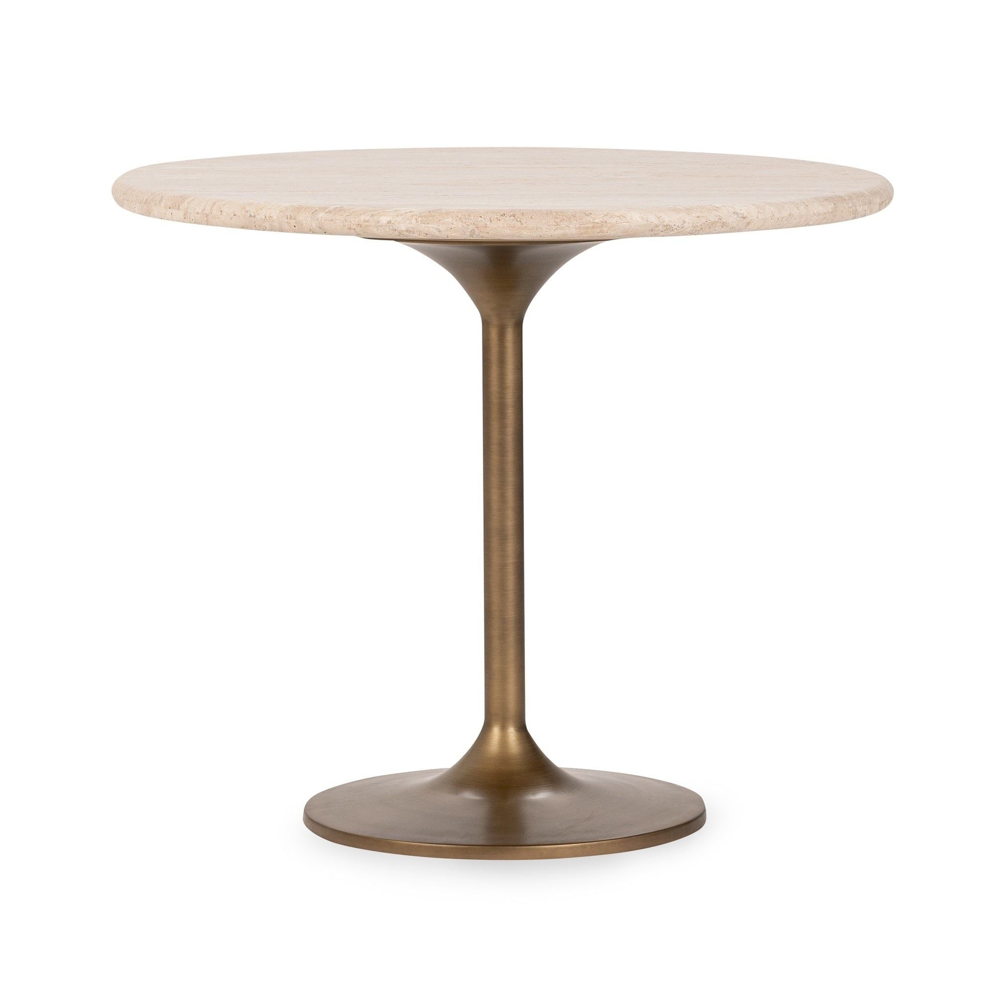 The Malani Table effortlessly merges the elegance of travertine with the sculptural beauty of its iron tulip base. With its timeless design, this piece evokes a sense of refined luxury, becoming the heart of any dining room. The natural stone and bold metal base create a harmonious balance, inviting shared moments of beauty and grace at the table.