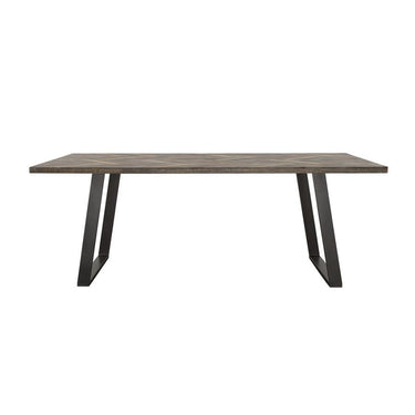 Perfect for a loft apartment, this industrial style dining table offers a mixed material design. Built with a solid grey sheesham and mango wood, this table was made to last in any home. Plus, with an intricate hand-crafted herringbone pattern inlay, this table is sure to take center stage. The spacious and rectangular tabletop surface offers seating for up to six people and is supported by a flared leg base in an iron gunmetal finish. Available within the same Misty collection are matching chairs, bench, and dining server to complete an entire rustic dining room ensemble.