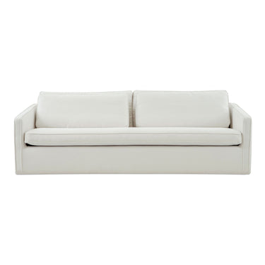The Phoebe sofa in ivory embodies transitional elegance with its minimalist form and tapered arms. The linear form is softened by a plush, feather-topped bench seat. Delicate piping adorns the arms and layered back cushions, adding tailored finesse. Upholstered in a soft, durable C0 performance fabric, it marries style with practicality.