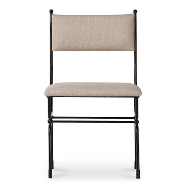 Gillian Segal for Moe's The Posta dining chair is inspired by the historical elegance of Italy's Posta Vecchia hotel, seamlessly marrying vintage allure with modern comfort. Its robust hammered metal frame underscores distinctive finial details on the back and base, echoing the Italian locale's enchanting spirit. Upholstered with soft fabric and featuring a curved back, this piece adds plush comfort with a touch of Italian finesse.