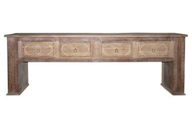 Add artisan charm to your home with this reclaimed wood console table with drawers. Featuring hand-carved sunburst motifs and a distressed natural finish, this rustic console table offers both style and function. Four spacious drawers provide practical storage for entryways, hallways, or living rooms. Crafted from eco-friendly reclaimed wood, this vintage-inspired accent table complements boho, farmhouse, and eclectic interiors. A stunning, sustainable piece that brings timeless beauty to any space.
