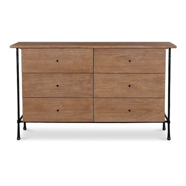 The Rene 6-drawer dresser harmoniously blends traditional charm with contemporary elegance through its beveled feet and mixed material construction. Crafted from solid Acacia wood, its wire-brushed finish reveals intricate grain patterns resting atop hammered iron legs, creating a floating effect. Meticulous craftsmanship shines through wood joinery details and contrasting iron handles as six spacious drawers offer ample storage.
