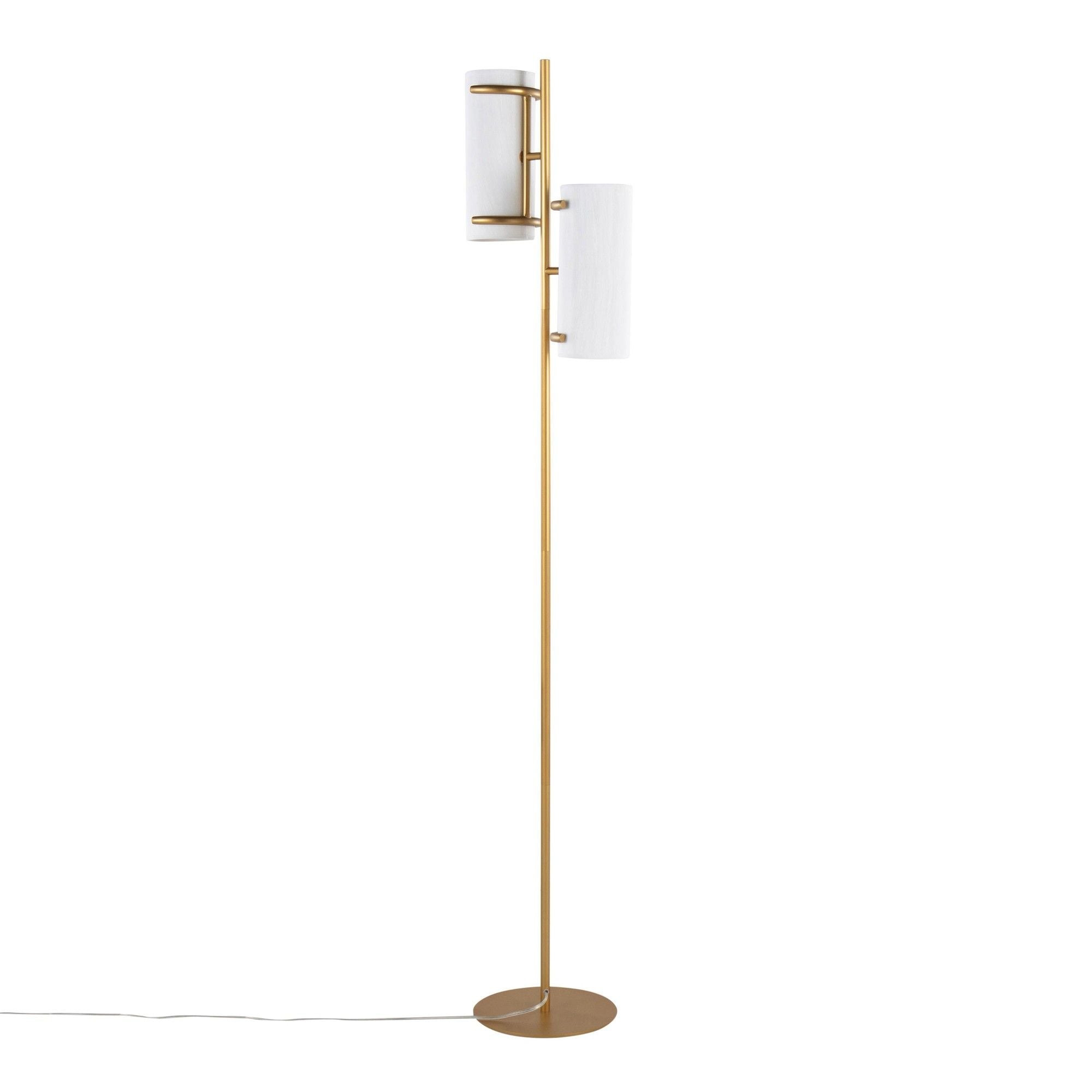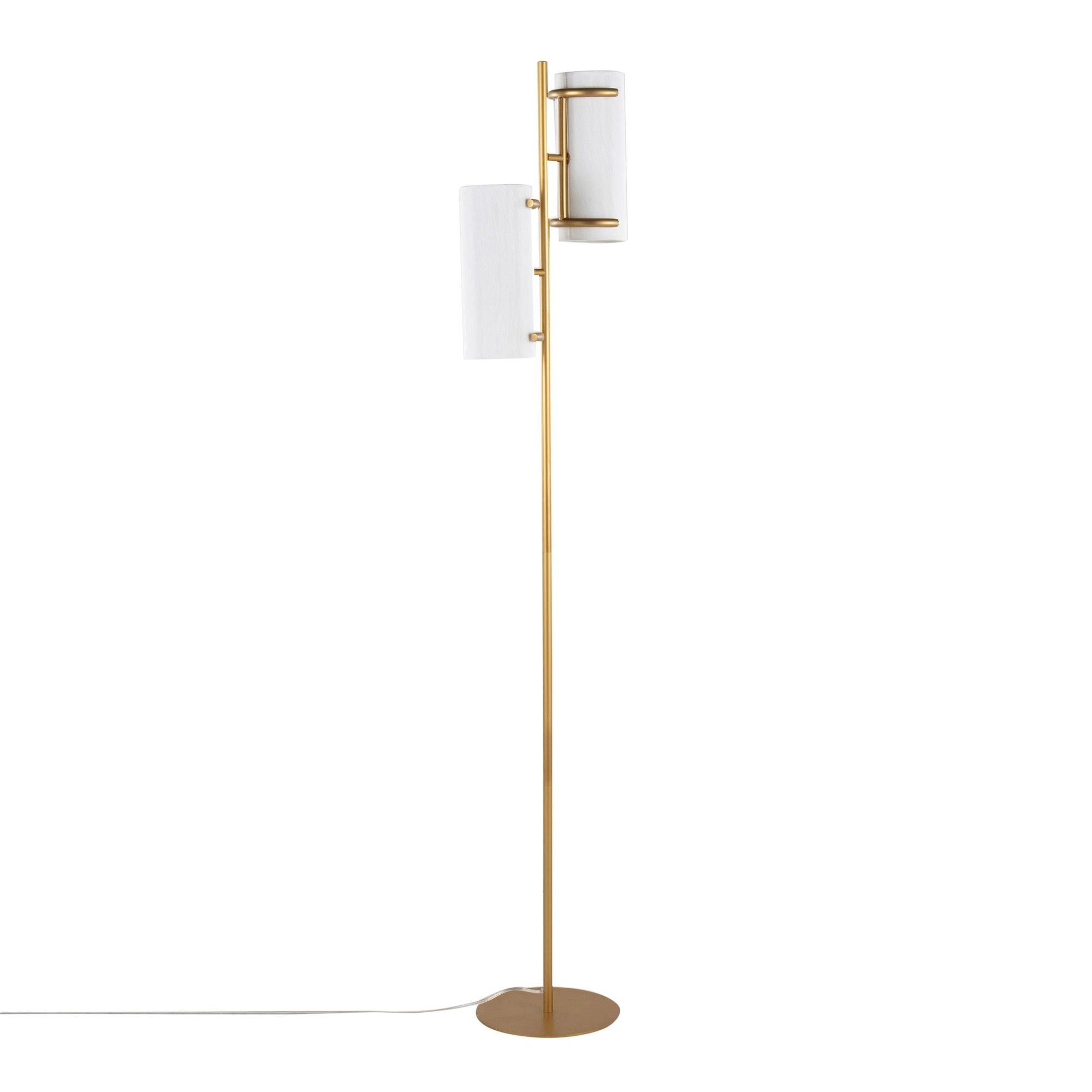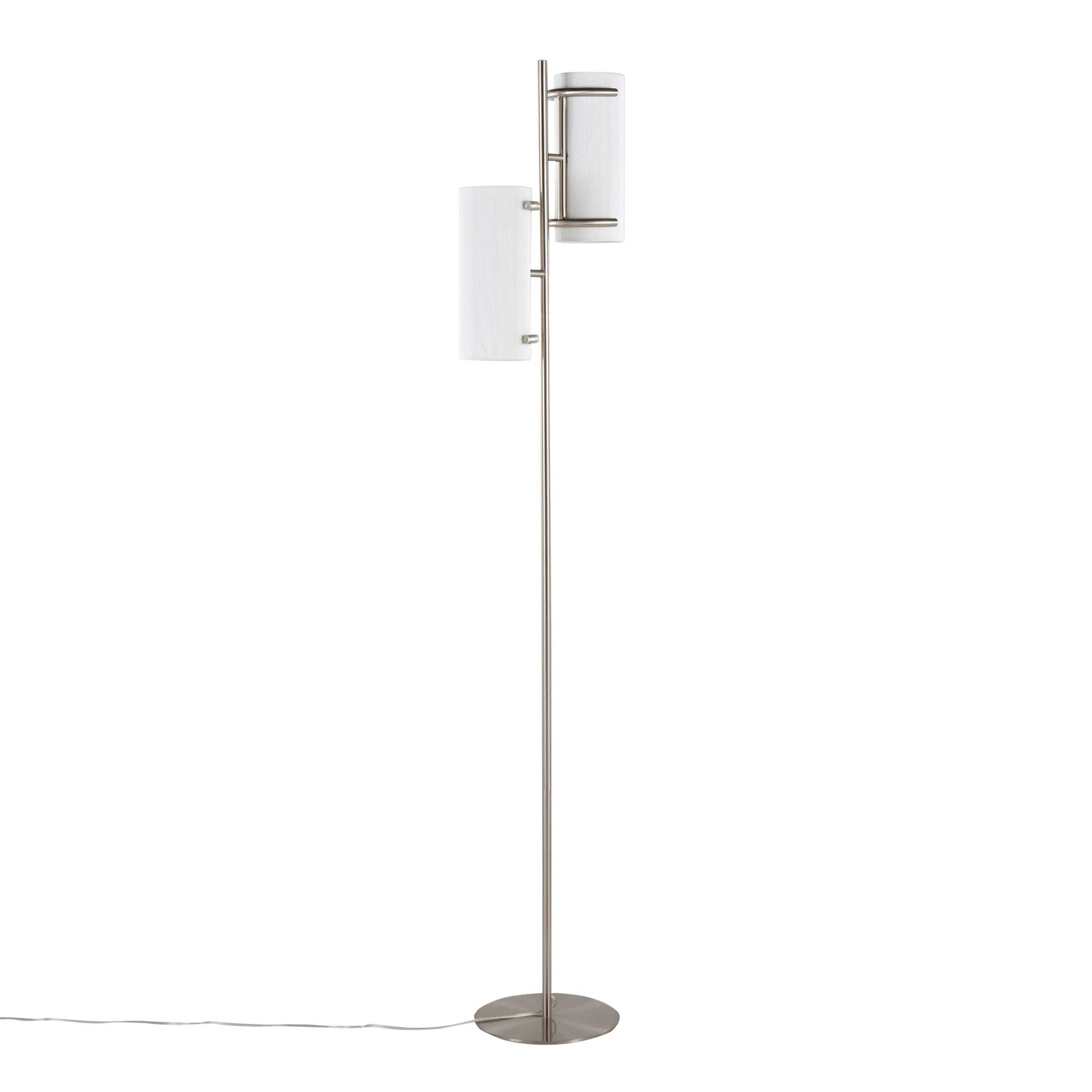 Brighten up any living space with the Rhonda Floor Lamp by LumiSource. The tall pedestal base features two individual can style lights, which can be used for task lighting or added ambiance. Each light is housed in white shades. Available in a gold or nickel finish.