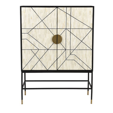 An aesthete's delight. The Shaws cabinet is a luxurious affair of solid mango wood and ornate bone veneer. Two large doors open up to an abundance of shelving space. Brass details finish off this imposing piece.