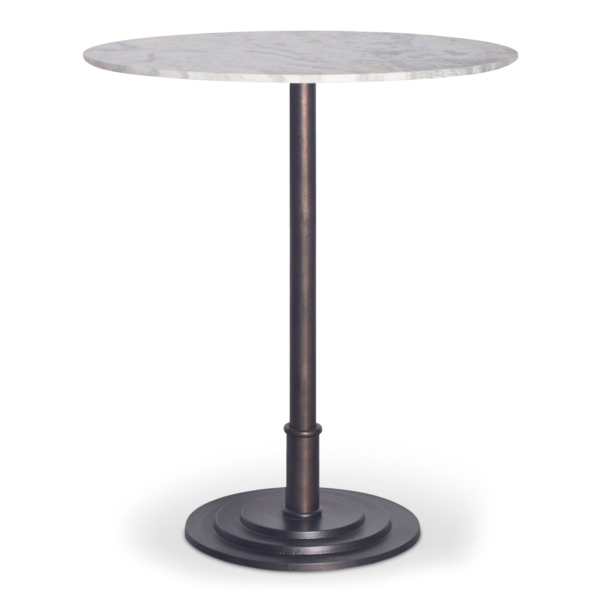 The Tori outdoor bar table creates a curated experience of lingering conversations and shared moments as unique white marble, with its natural veining, crowns a refined cast aluminum base. Three cascading circular tiers create an intriguing silhouette, while a cylindrical detail lightly punctuates this versatile outdoor safe piece.